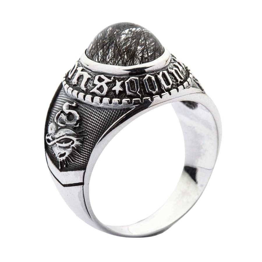 Este anillo es una sinfonía de poderosos símbolos espirituales, diseñado para una visión serena y tranquila del mundo. En su centro descansa un gran cabujón pulido de auténtico cuarzo rutilado negro, una piedra única valorada por sus inclusiones de agujas de turmalina negra y su supuesta capacidad para potenciar el potencial y mejorar el rendimiento laboral.