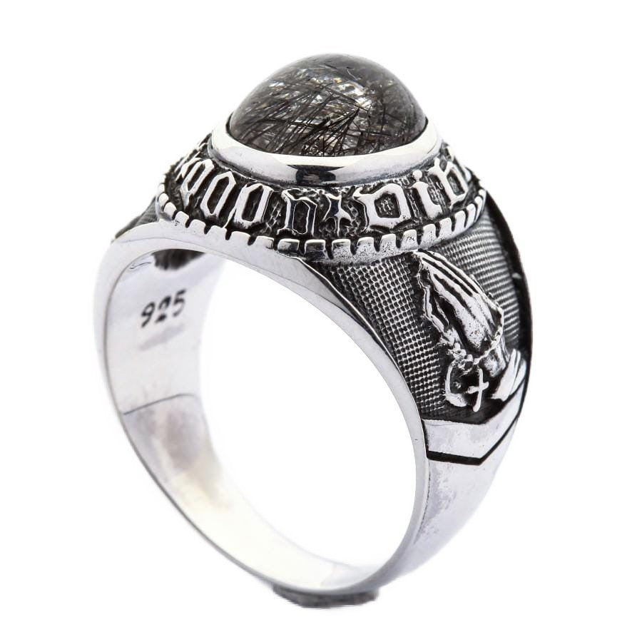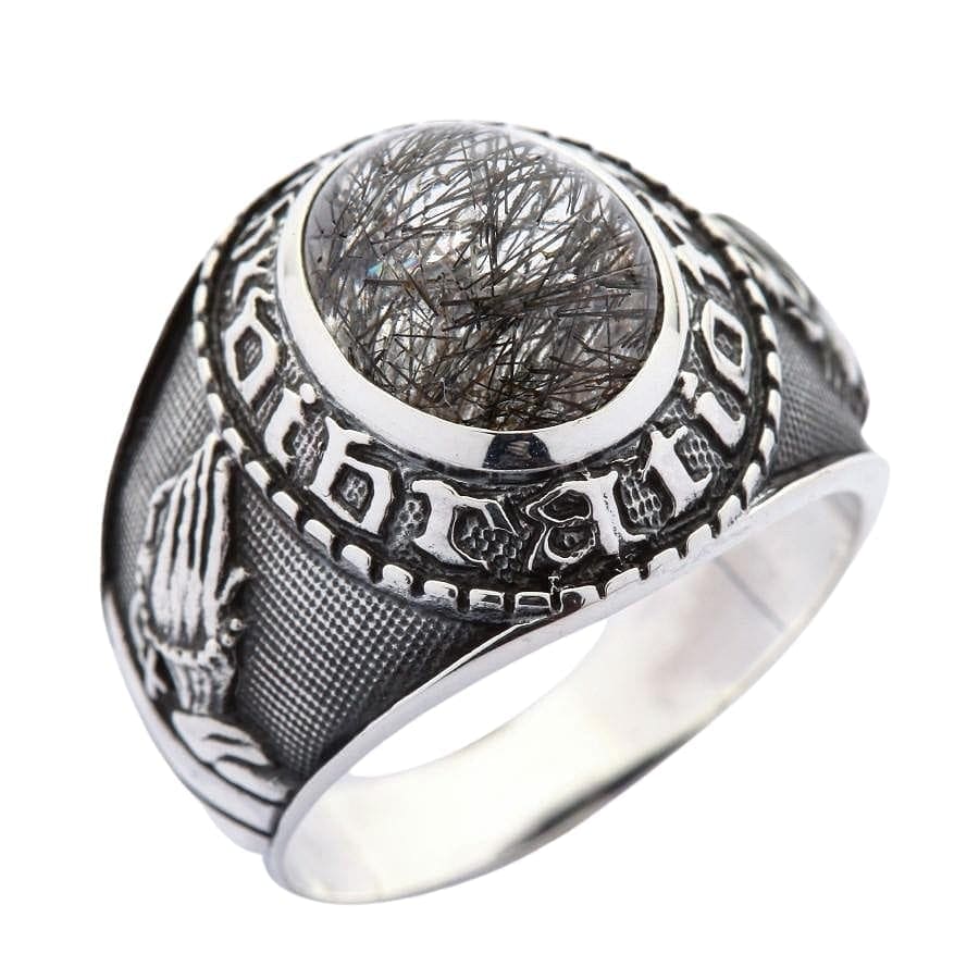 Anillo de manos rezando y corazón sagrado con cuarzo rutilado negro