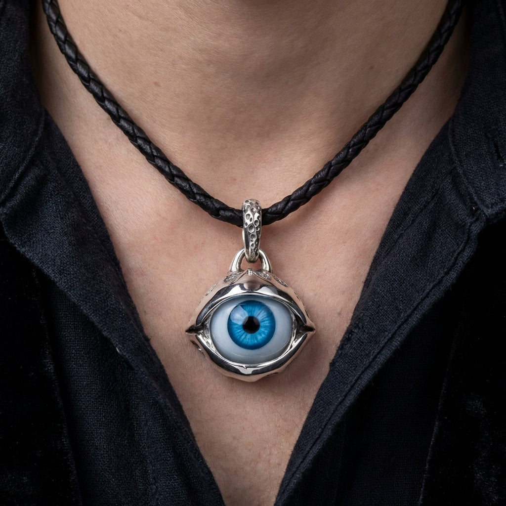 Este colgante de ojo en plata de ley es una obra de arte portátil, hecha a mano de forma individual por nuestros maestros artesanos. Su peso considerable de 17 gramos transmite solidez y seguridad, mientras que los 'párpados' pulidos en alto brillo enmarcan de manera espectacular el cautivador iris azul. Como pieza destacada de nuestra colección de joyas de ojo, también es un ejemplo perfecto de colgante gótico moderno, fusionando creencias ancestrales con una estética oscura y surrealista.