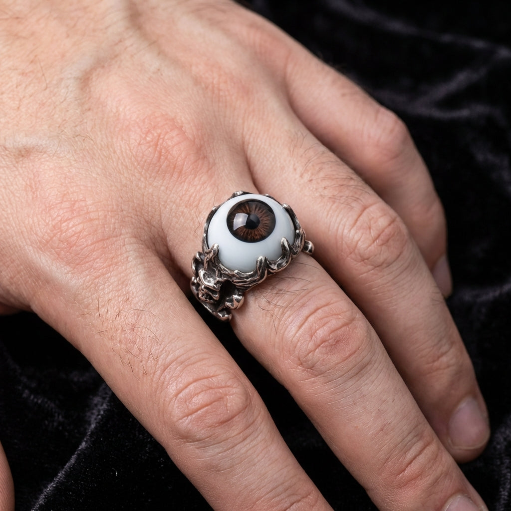 Q: What does a skull eyeball ring symbolize? A: A gothic skull ring with a brown eye is a powerful symbol in macabre art. It often represents hidden knowledge, the 'all-seeing eye,' or a defiance of mortality. It's a piece of horror-inspired art that symbolizes a rebellious and non-conformist attitude, perfect for Gothic Rings collectors.