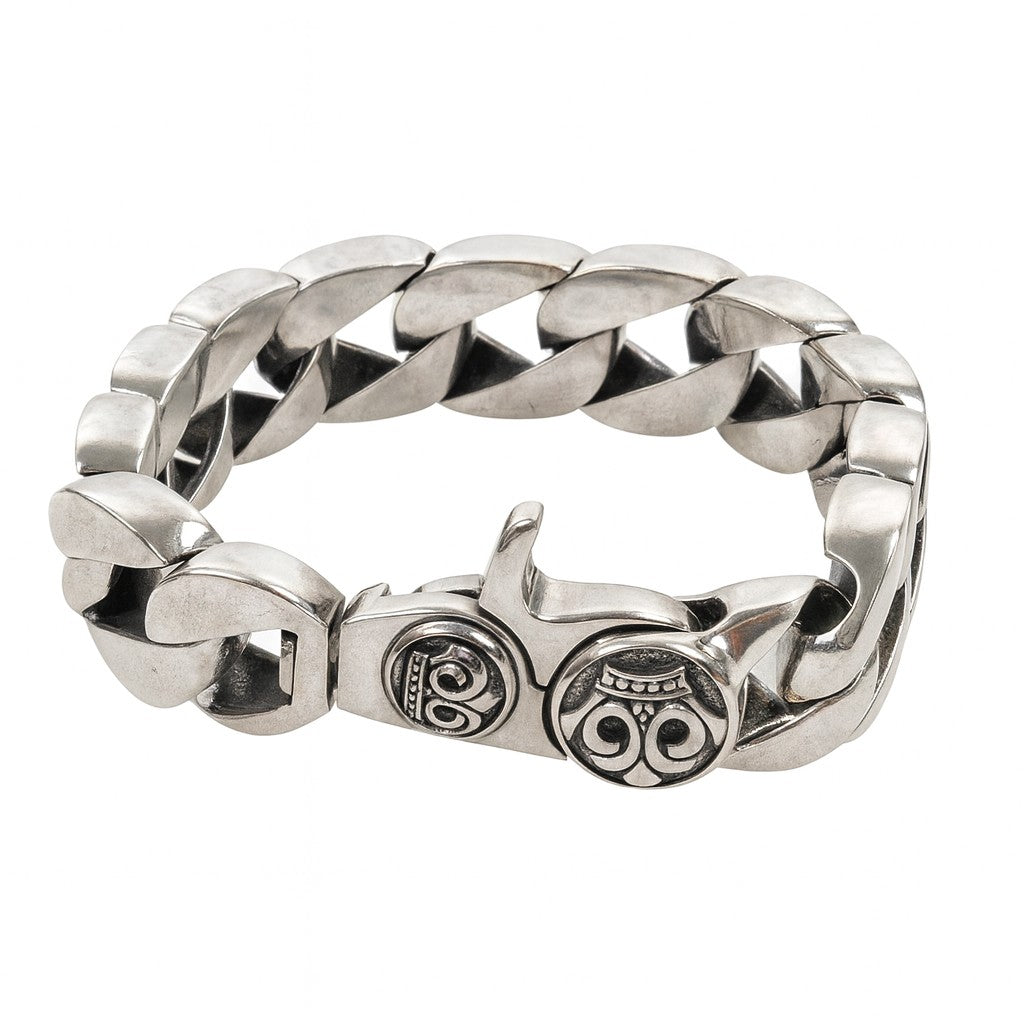 Haz una declaración audaz con nuestra Pulsera biker cubana con corona en plata de ley 925 para hombre, magistralmente hecha a mano en plata de ley .925 maciza. Esta robusta pulsera exhibe un sofisticado diseño de eslabones cubanos, pulidos a la perfección para un acabado lujoso y llamativo. Destaca un sutil pero distintivo emblema de corona en el cierre robusto, símbolo de fuerza, poder y estilo. Con su impresionante peso de 145 gramos y un ancho sustancial de 19 mm (6/8 pulgadas), ofrece una sensación sólida y premium, perfecta para el uso diario o para ocasiones especiales. Meticulosamente elaborada a mano por artesanos expertos, cada pulsera garantiza una calidad y autenticidad excepcionales, confirmadas por el sello .925. Tanto si eres motero como si simplemente aprecias la joyería distintiva, esta pulsera aporta confianza y carisma a tu estilo.