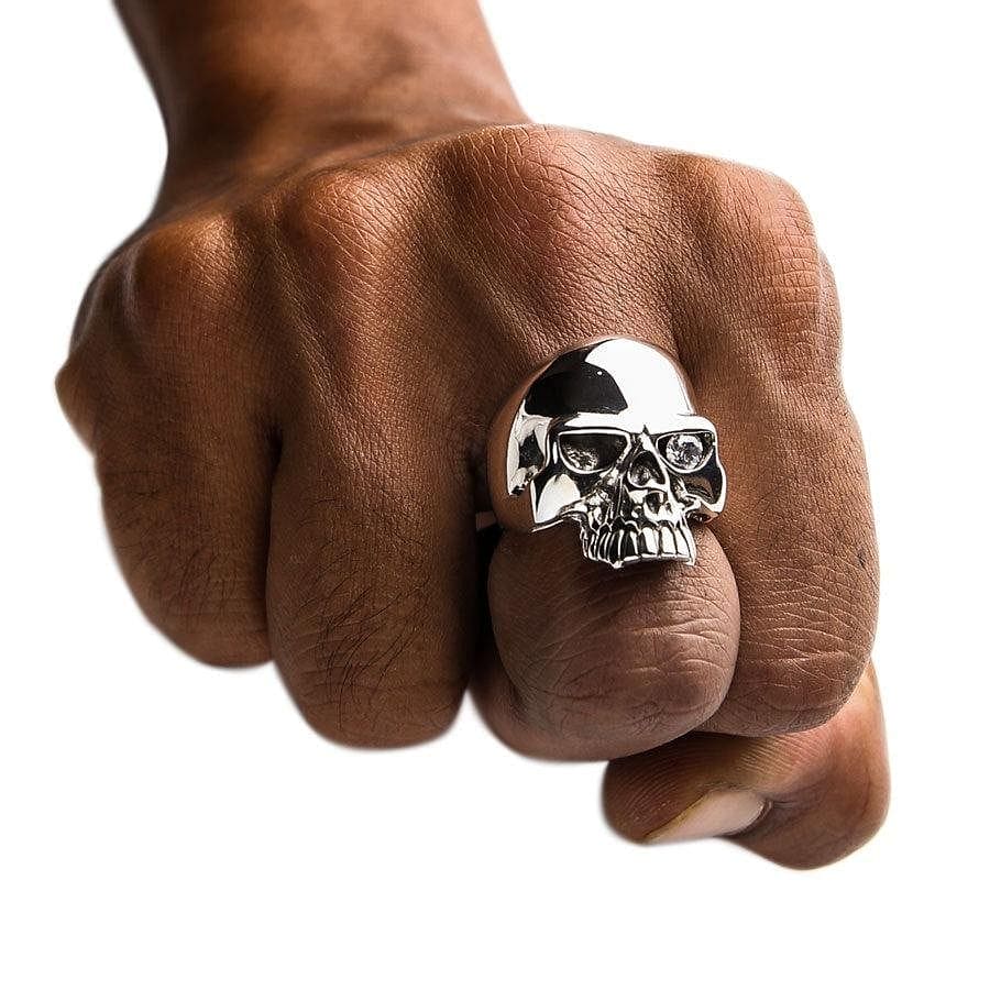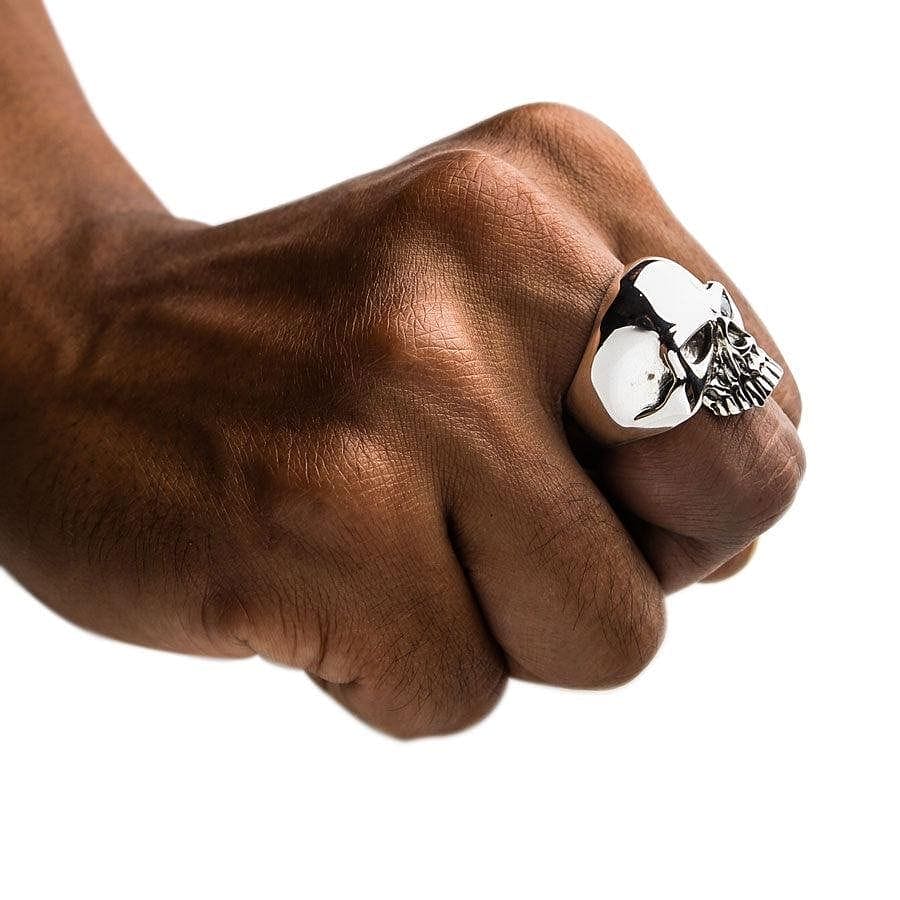 P: ¿Es cómodo este anillo? R: A pesar de ser un anillo de calavera de plata grande y pesado, está diseñado con una banda gruesa, lisa y sólida para un ajuste confortable. Sus 25 gramos de peso son sustanciales y notorios, lo cual es parte fundamental de su atractivo para quienes aman las joyas llamativas y de alta calidad.