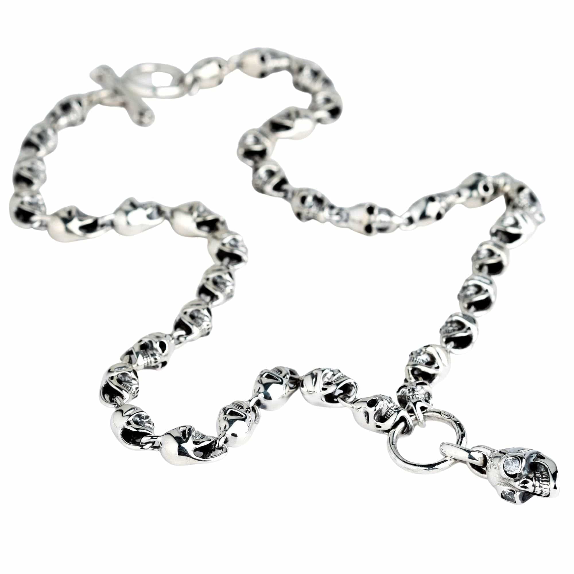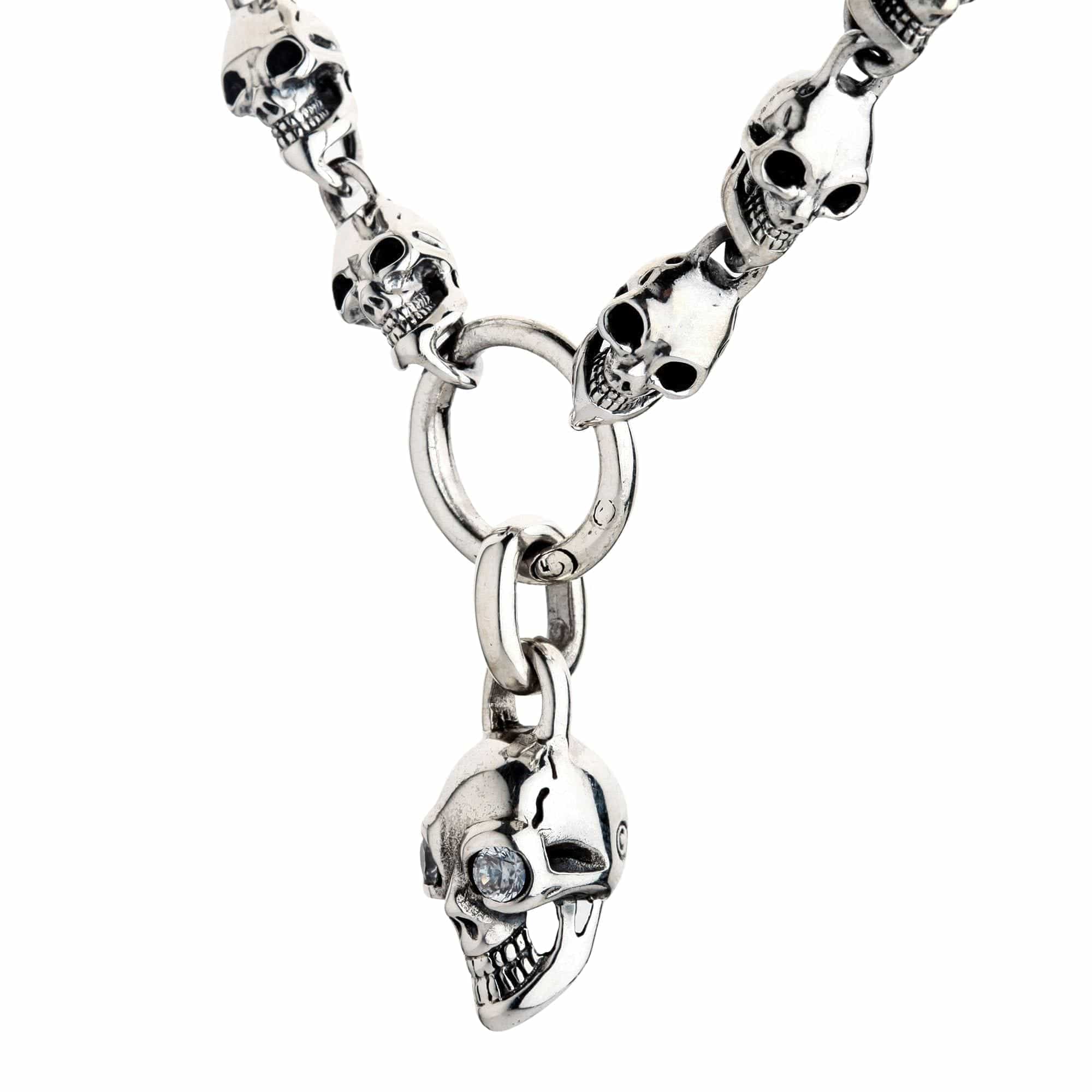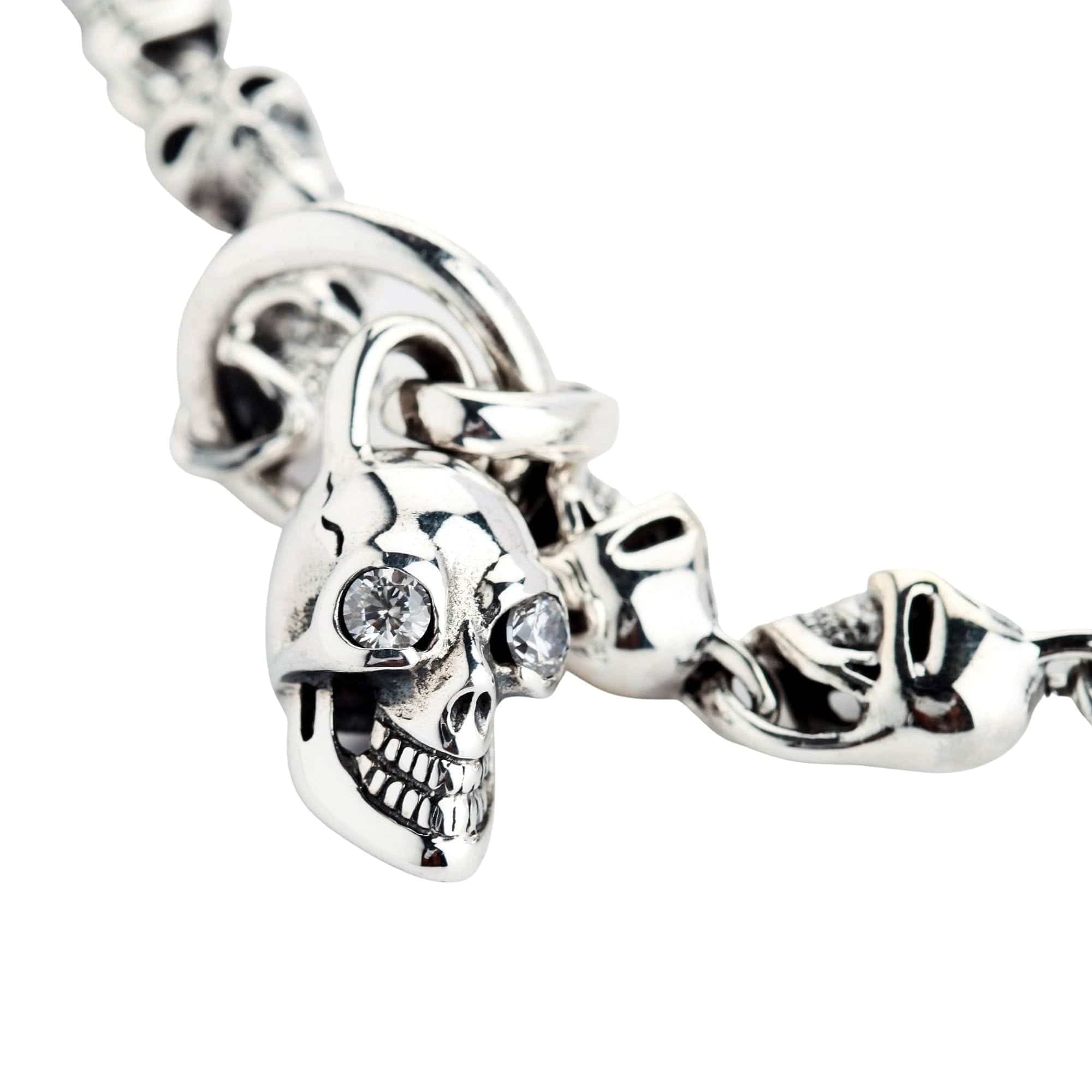 Diseño: Motivos de calaveras intrincados a lo largo de la cadena, que culminan en un colgante maestro de calavera con ojos de circonita cúbica transparente como diamante.
