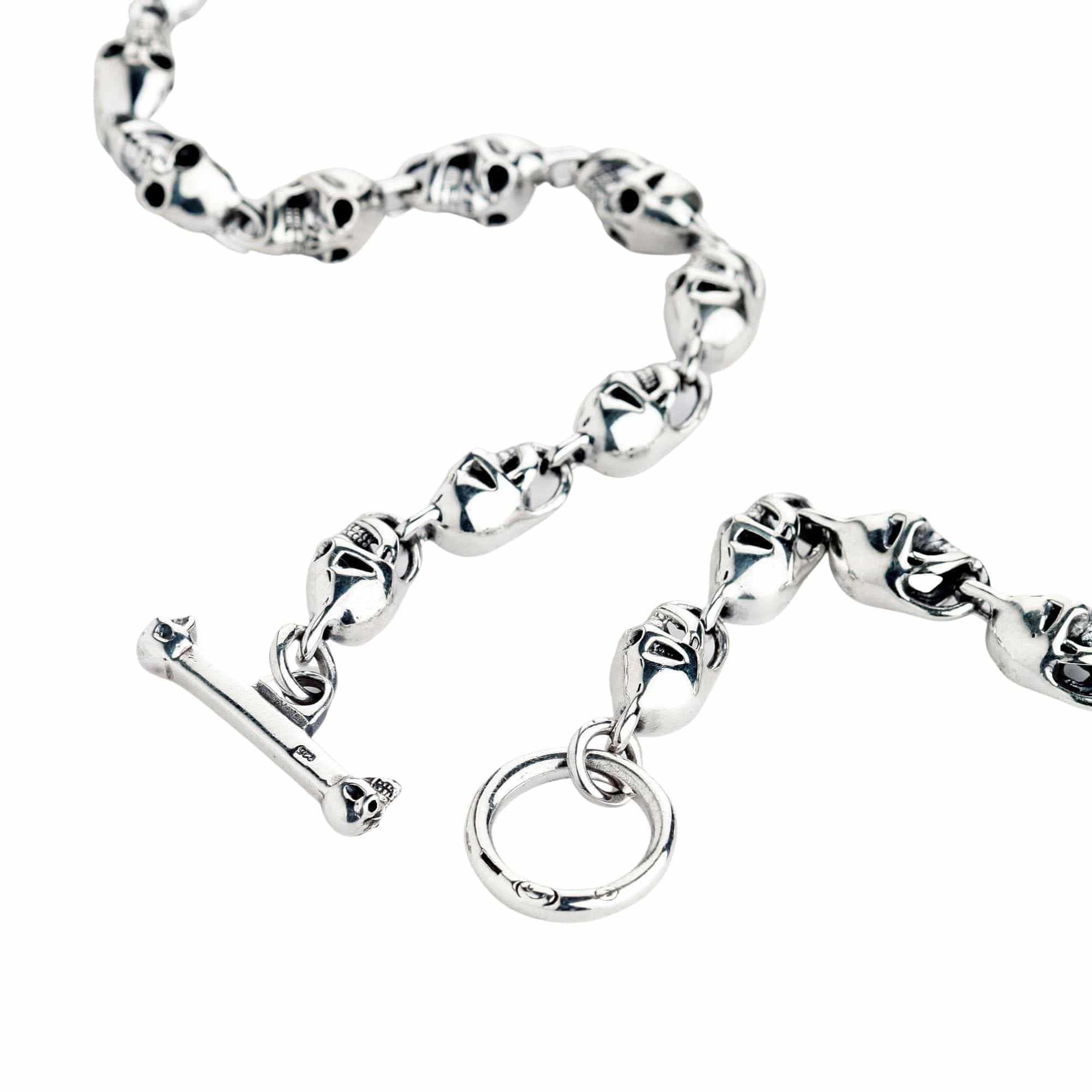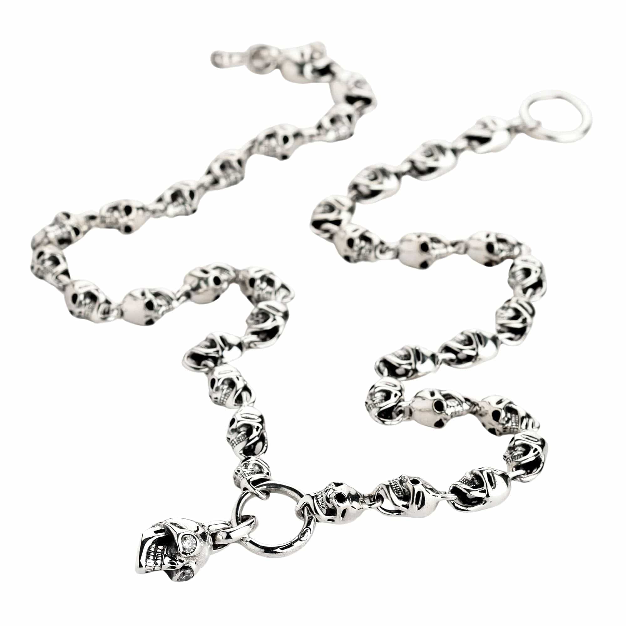 Elaborado magistralmente en plata de ley 925 maciza, este collar motero presenta una serie de calaveras finamente detalladas a lo largo de la cadena, culminando en un destacado colgante de calavera adornado con piedras de circonita cúbica transparente en los ojos. El acabado ligeramente oscurecido acentúa cada detalle macabro, realzando su atractivo rudo y atemporal.