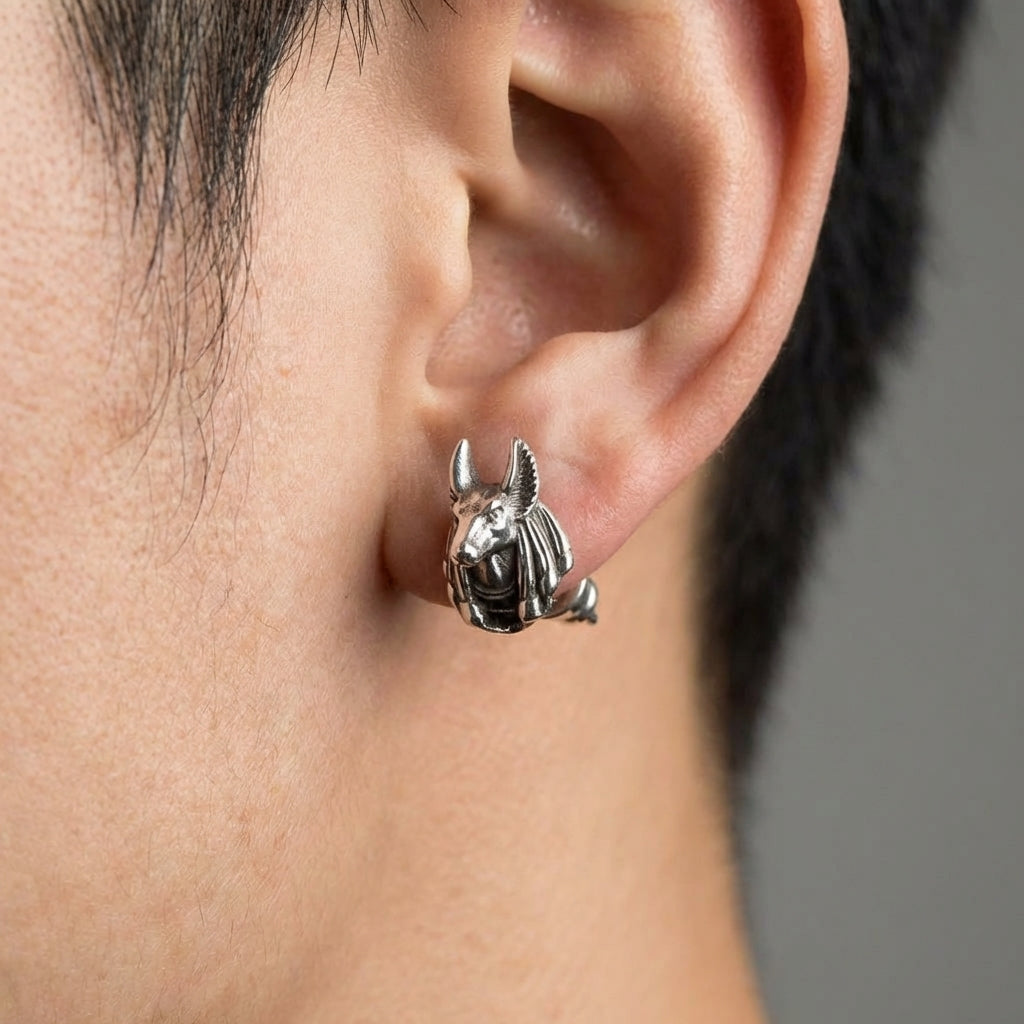 Si usas pendientes a diario y buscas algo más allá de los clásicos puntos de plata — Con 2 gramos por par y 8×11mm cada uno, se ajustan perfectamente al lóbulo sin tirar ni balancearse. La silueta de Anubis es reconocible de cerca, pero lo bastante discreta para cualquier entorno: oficina, estudio o clase.