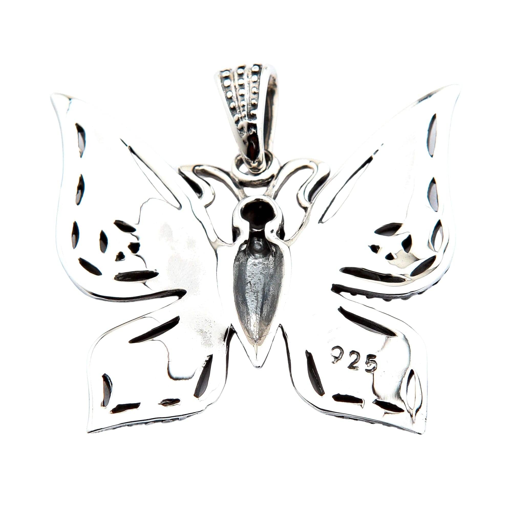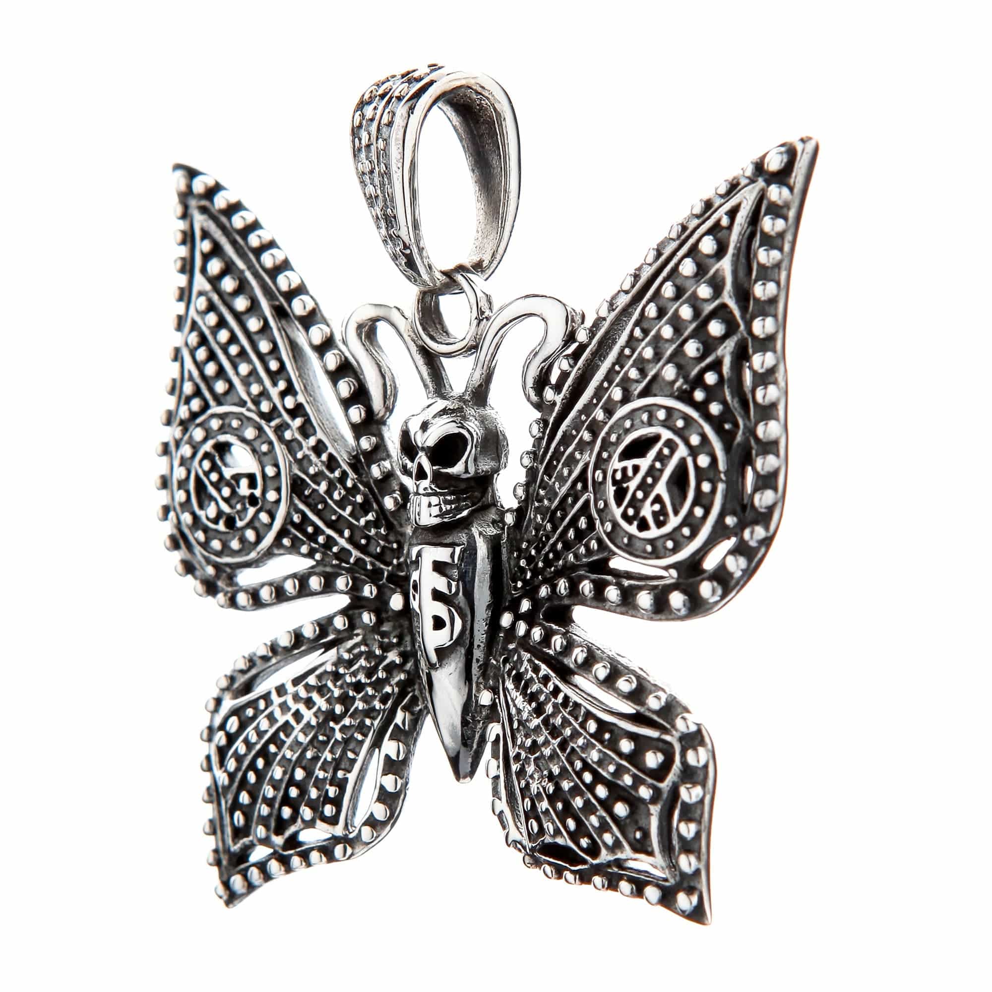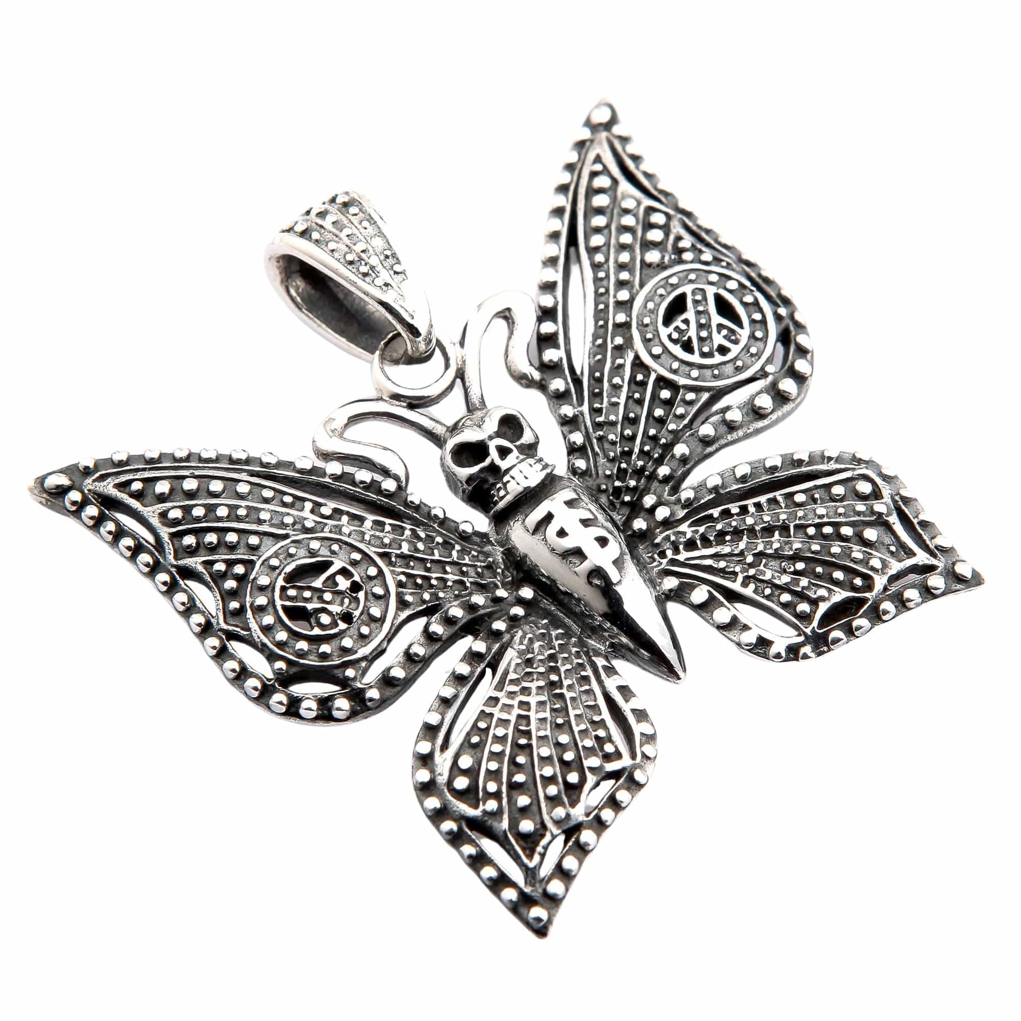 Este colgante es una paradoja para llevar puesta, fusionando símbolos de vida, muerte y transformación en una pieza impresionante. Su forma es la de un majestuoso insecto alado, evocando tanto la delicada mariposa—símbolo del alma y la renovación—como la nocturna polilla de la calavera, un poderoso presagio gótico. En el centro se encuentra una sombría calavera, claro recordatorio de nuestra mortalidad compartida. La verdadera maestría reside en las exquisitas alas caladas de filigrana, auténticos tapices de patrones calados, texturas perladas y misteriosos símbolos, creando una increíble sensación de profundidad y complejidad. Con un peso considerable de 21 gramos, esta pieza de plata pesada transmite la importancia de la historia que cuenta.