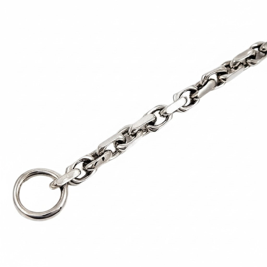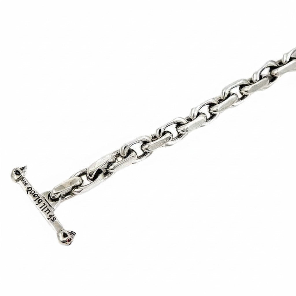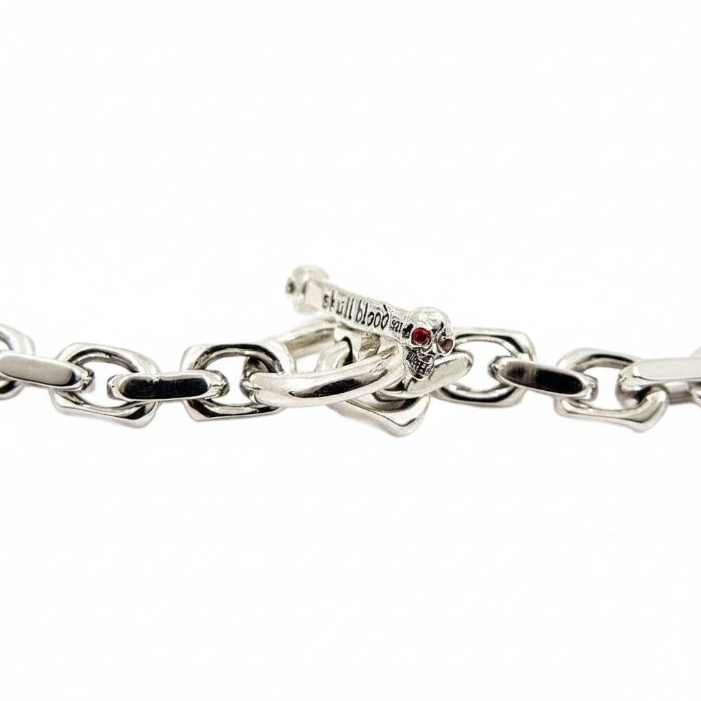 La base de este collar es una clásica y ultra-masculina cadena de eslabones de plata de ley de 10 mm. Cada eslabón grueso e interconectado está pulido hasta un brillo deslumbrante, creando una imagen de pura potencia. Pero lo que realmente distingue a esta pieza es su espectacular cierre: en lugar de un cierre estándar, lleva un cierre de barra en T diseñado a medida, custodiado por una amenazante calavera con ojos de granate rojo. La barra en T, grabada con las palabras "Skull Blood", pasa por un gran aro para crear un cierre seguro y elegante que se convierte en el centro del collar. Con un peso total impresionante de 105 gramos, este collar es una pieza de plata sustancial, increíble de llevar e imposible de ignorar.