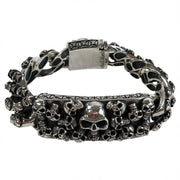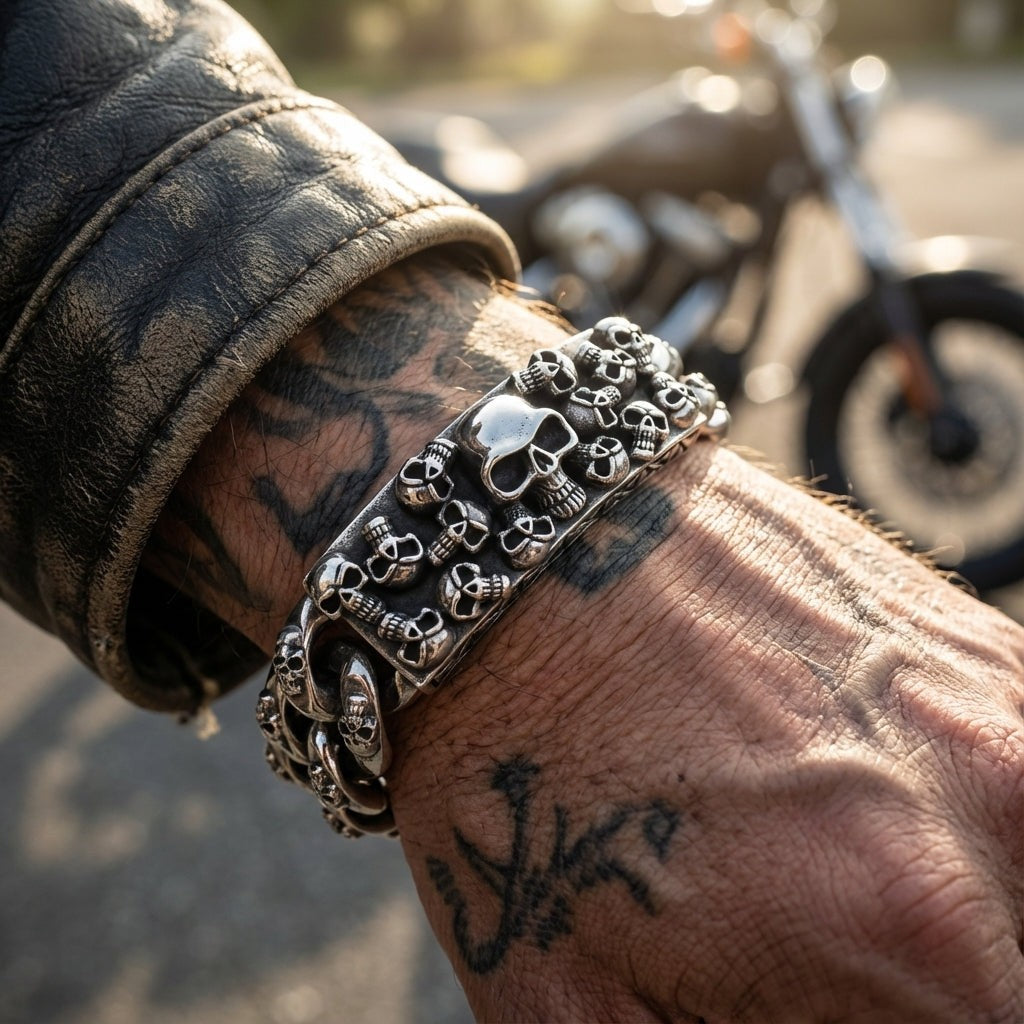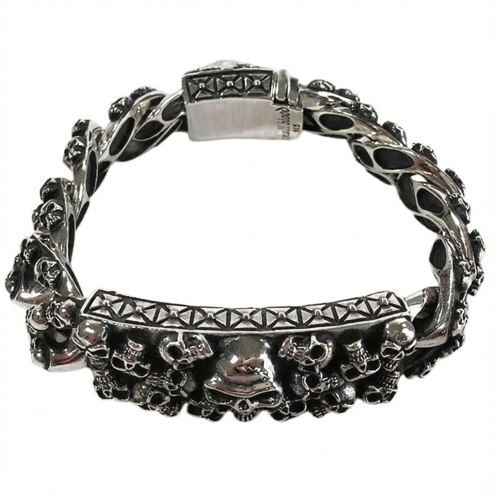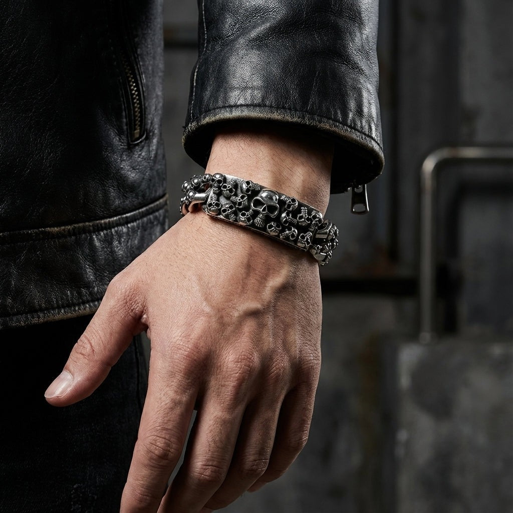 ✅ Múltiples calaveras detalladas – Intrincados grabados de calaveras adornan la pulsera, con una calavera central prominente que aporta un estilo gótico audaz.