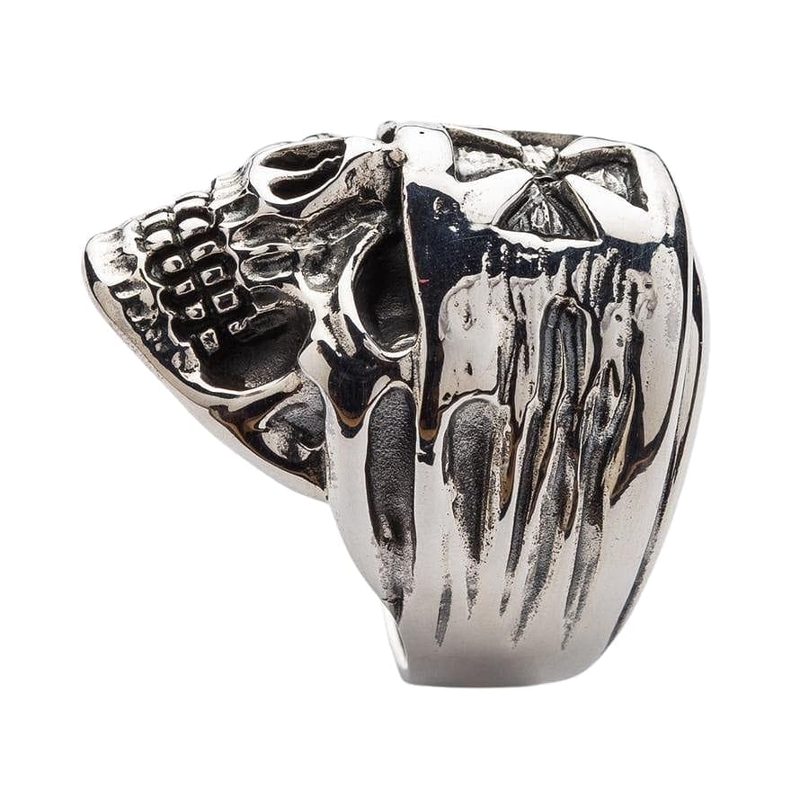 Este anillo es una fusión potente de dos de los símbolos más poderosos y respetados en la cultura motera. La calavera, sombría y desafiante, representa la mortalidad y los lazos irrompibles de la hermandad. En su frente lleva atada una robusta bandana o cinta, luciendo orgullosamente la icónica Cruz de Hierro—un símbolo histórico de coraje, recuperado por los moteros del posguerra como emblema definitivo de inconformismo.