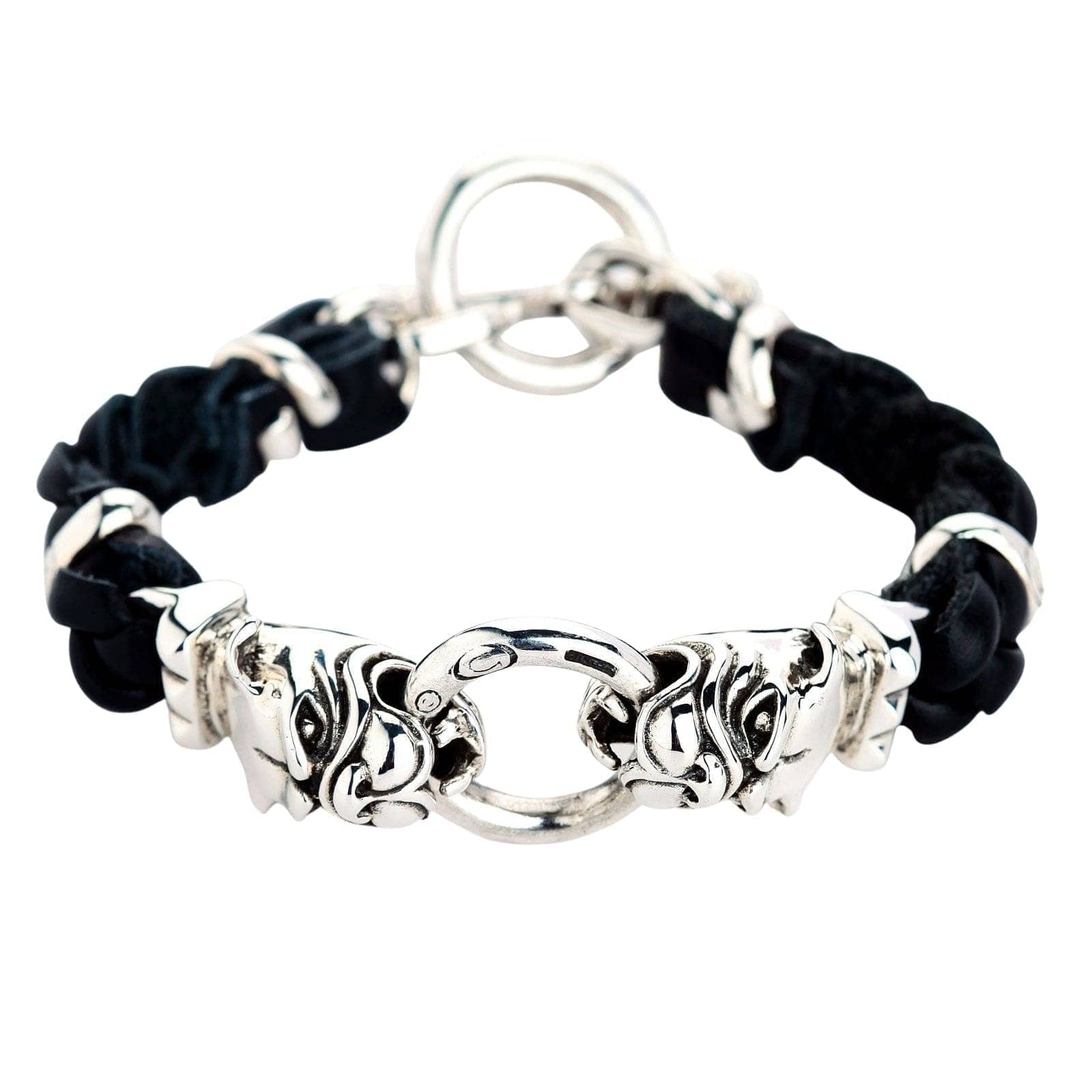 Pulsera de cuero para hombre de plata esterlina con diseño de bulldog