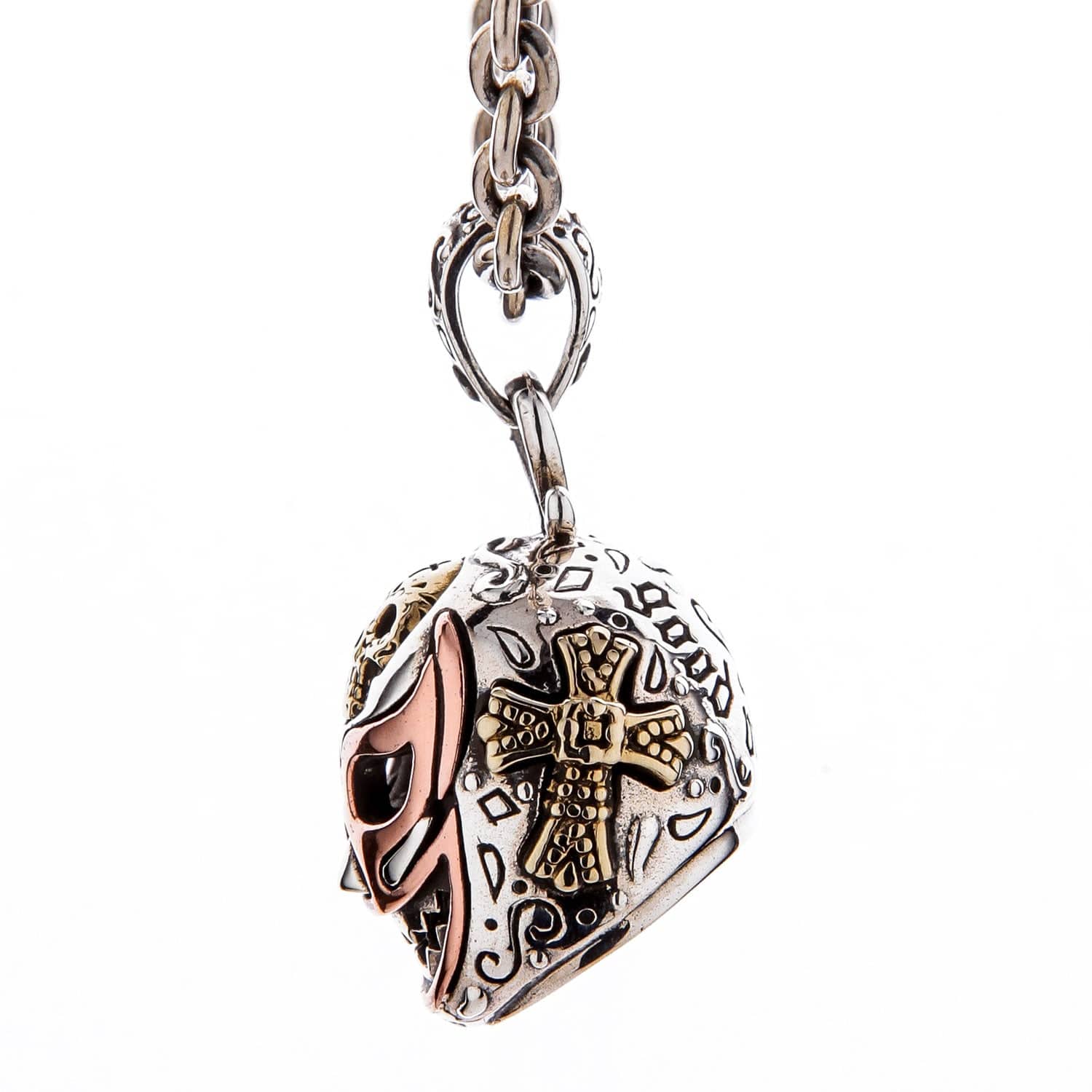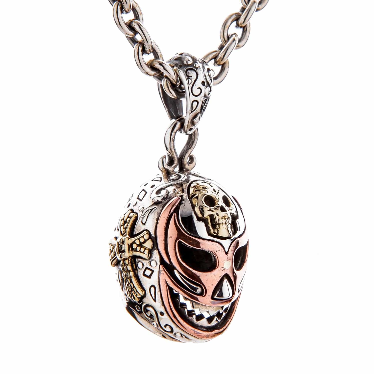 🎨 Exquisita artesanía tri-metálica: Un diseño impresionante y de alto contraste forjado en plata de ley 925 maciza y bellamente complementado con latón macizo (calavera, cruz) y cobre (detalles de la máscara).