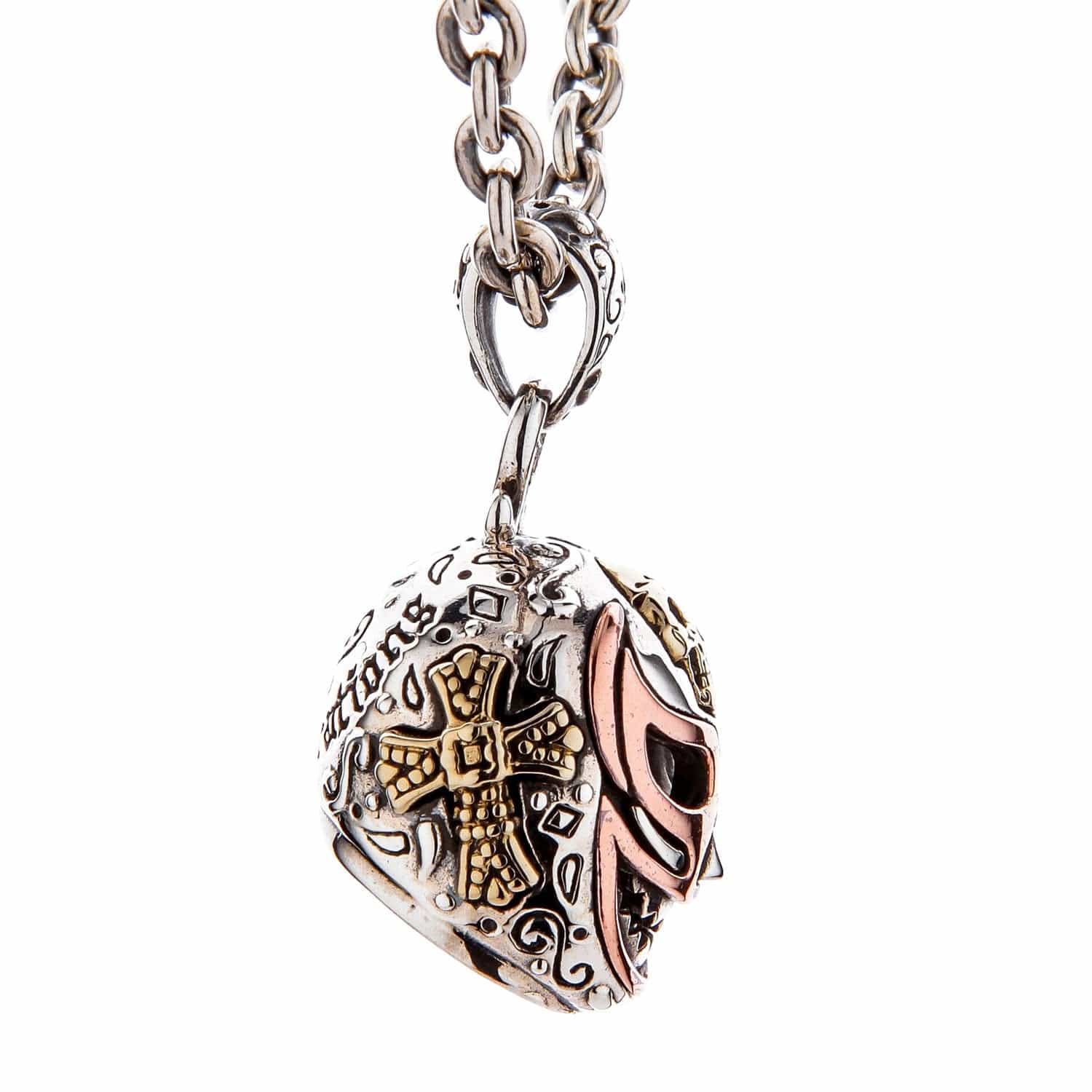Este colgante es una obra maestra de fusión cultural. Captura magistralmente la icónica máscara de luchador, símbolo sagrado de la identidad y el honor del luchador, e incorpora un toque oscuro y gótico. La base de plata de ley es un lienzo para grabados intrincados y dos potentes símbolos: una cruz de latón dorada y una amenazante calavera de latón. Los detalles de ojos y boca de la máscara están realizados en cálido cobre, culminando en un impresionante diseño metálico tricolor. La parte trasera también destaca, con grabados únicos y el lema "Good Vibrations" para un extra de personalidad. Es una historia llevable sobre el código del guerrero, mezcla de lo sagrado y lo profano, el héroe y el antihéroe.