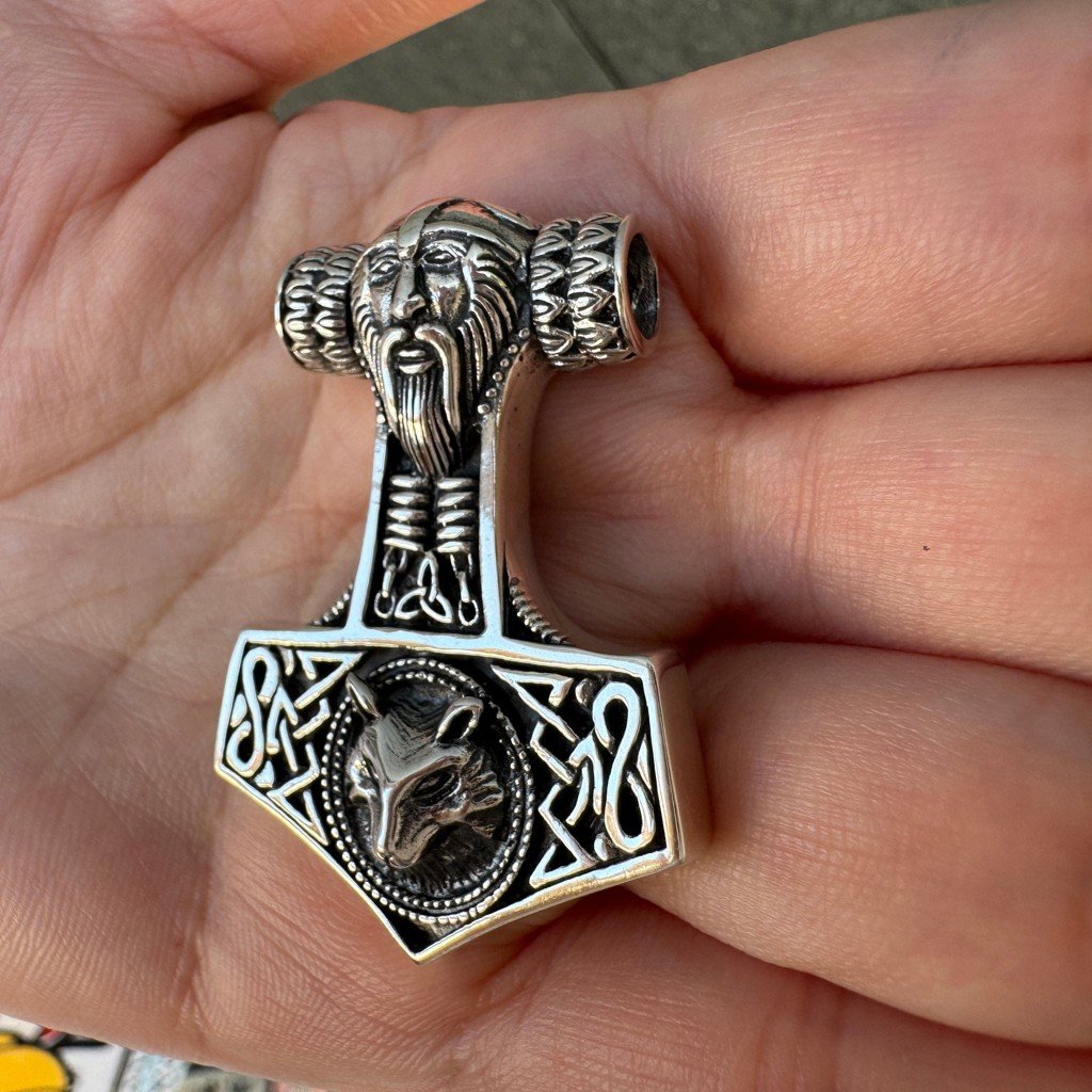 El rostro barbado de Thor forma la base de este martillo. Fenrir, el lobo gigante, se enrosca alrededor del mango superior con las fauces abiertas. Dos figuras de lados opuestos del Ragnarök forjadas juntas en un solo colgante de plata de ley .925. La forma del martillo es Mjolnir, de 30 × 43mm, con cada detalle tallado en 15 gramos de plata maciza.