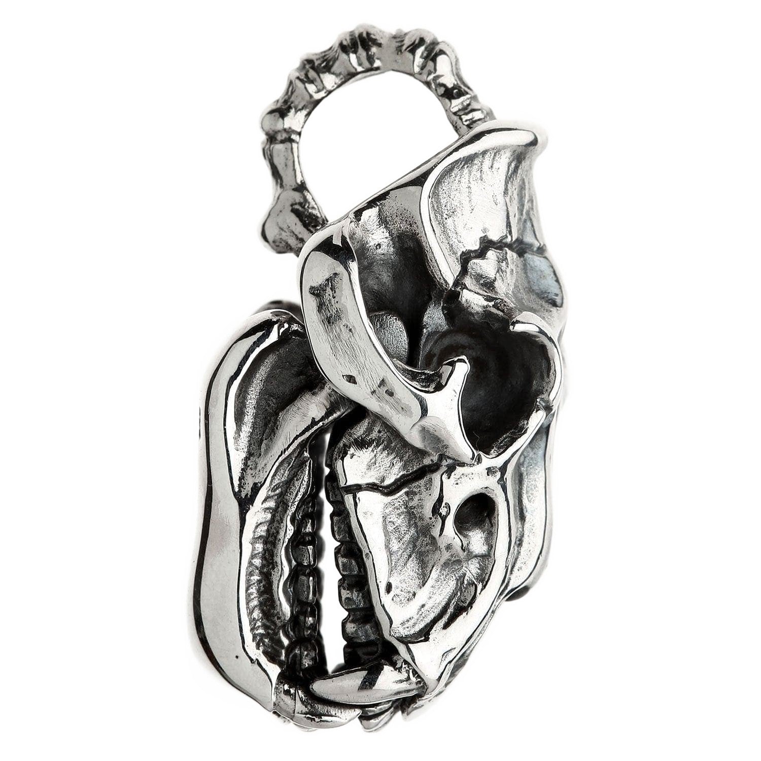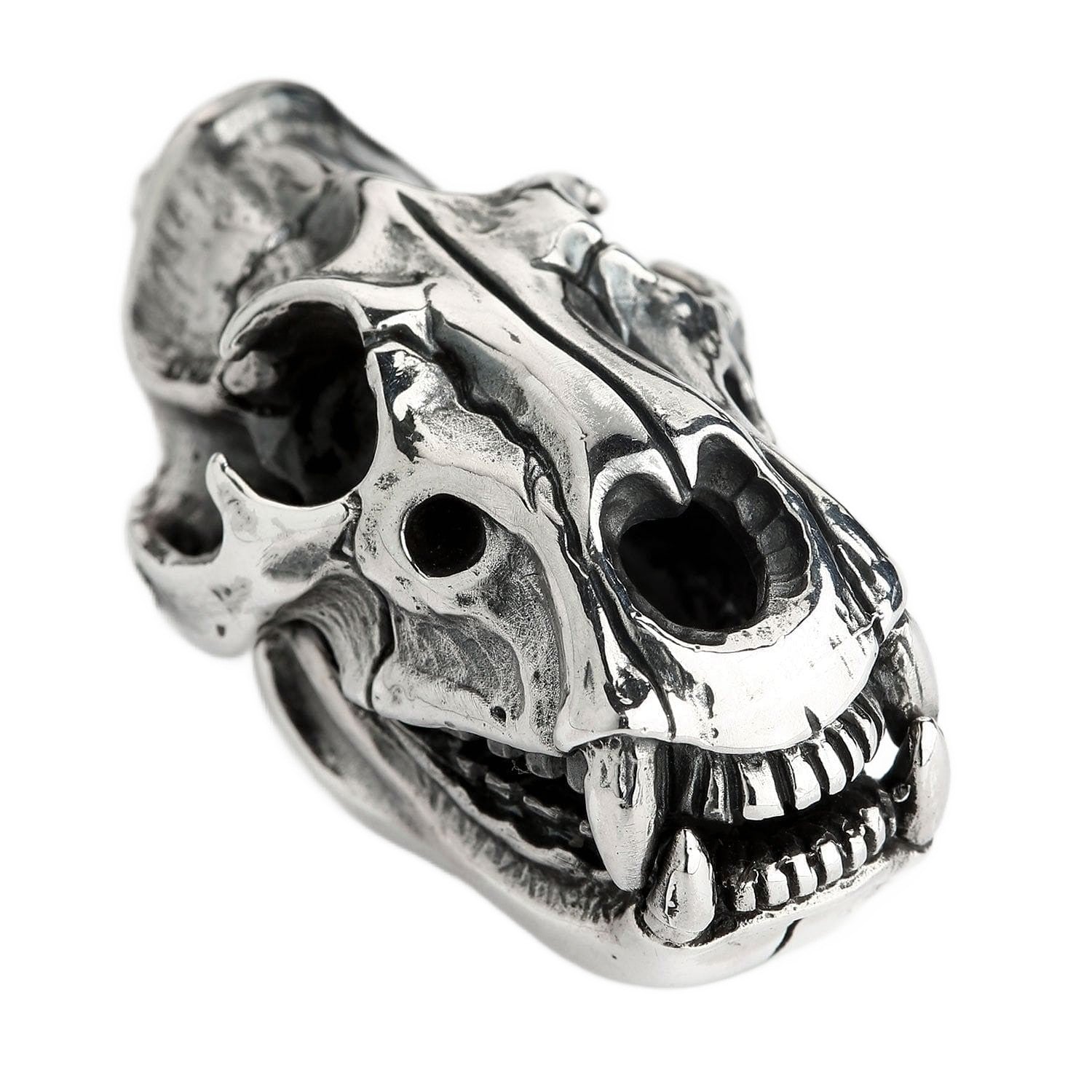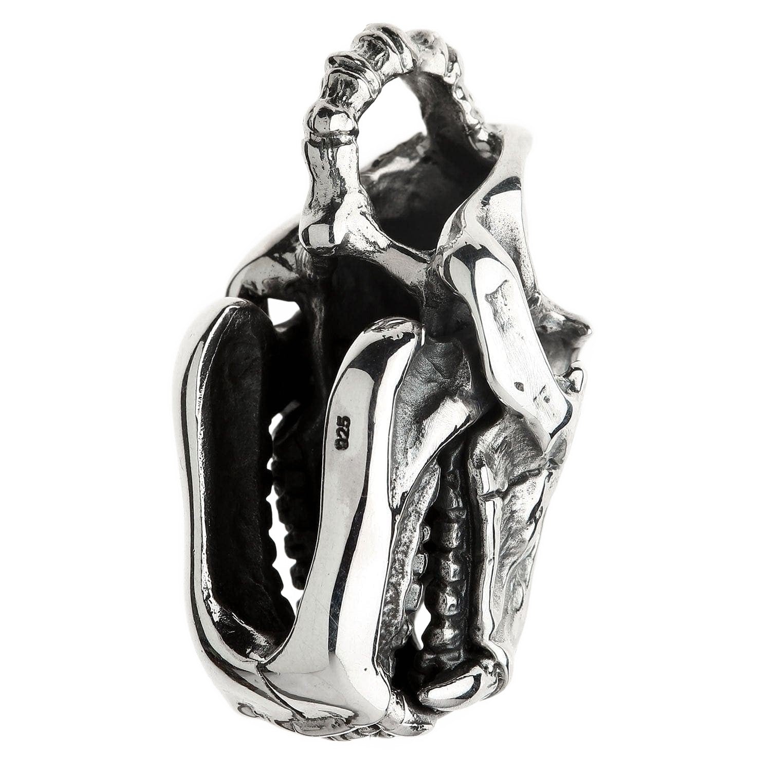 La ornamentada anilla, con aspecto de hueso, acentúa su aire rudo y de artefacto, dándole la apariencia de un trofeo ganado con esfuerzo. Este pesado colgante de calavera de tigre es una obra maestra artesanal, con cada grieta, hendidura y diente esculpido meticulosamente por nuestros maestros plateros. Un profundo acabado oxidado aporta una asombrosa sensación de realismo y profundidad que hace que la plata de ley 925 pulida brille como un hueso impecable.