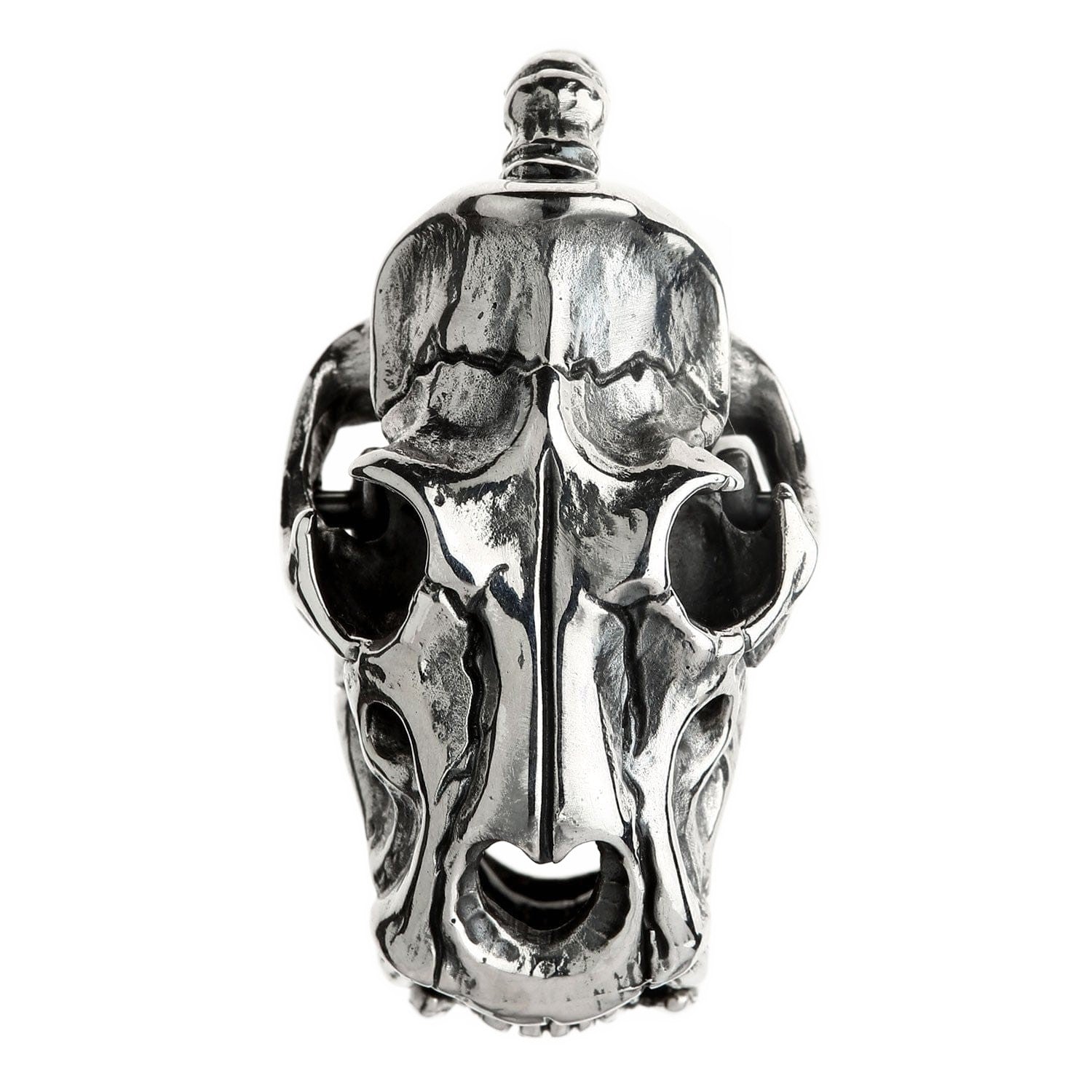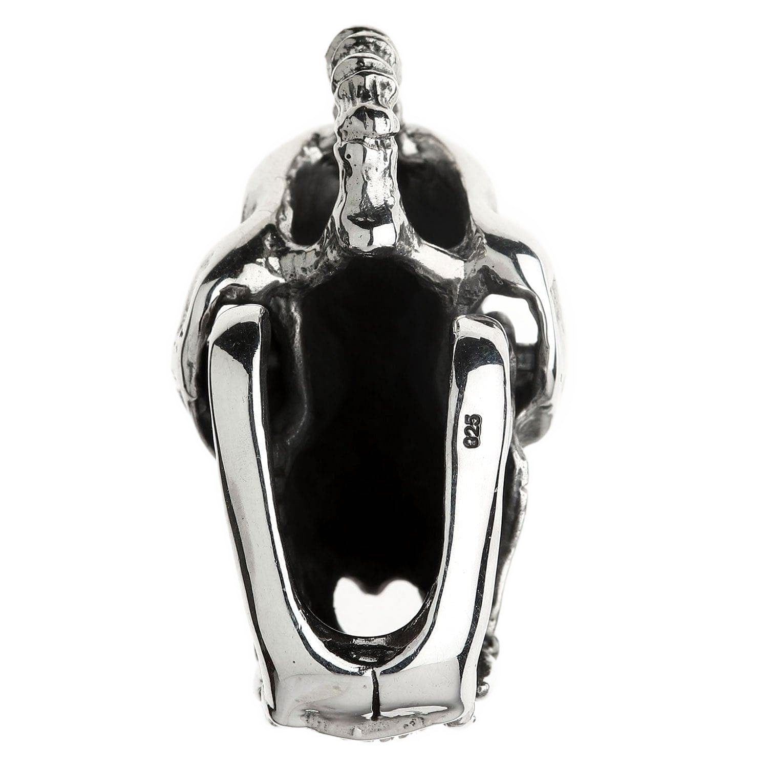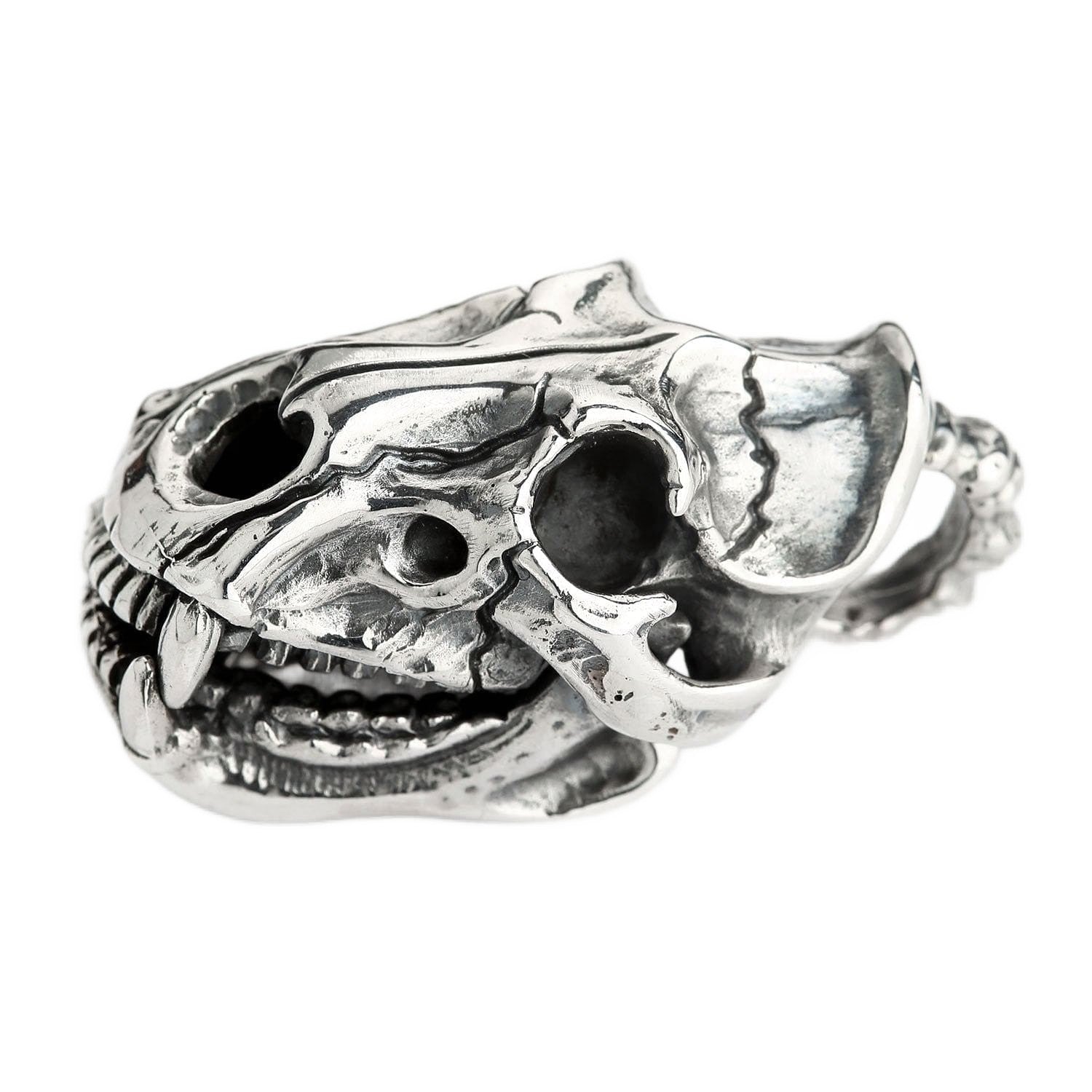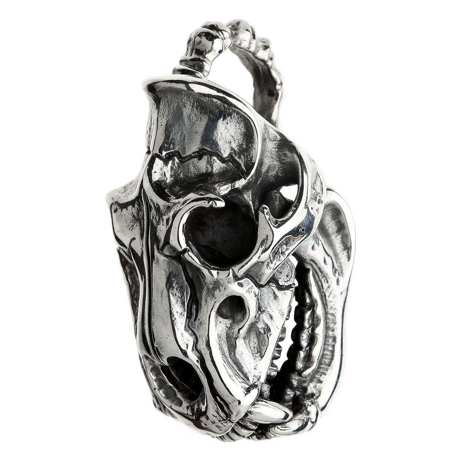 La ornamentada anilla, con aspecto de hueso, acentúa su aire rudo y de artefacto, dándole la apariencia de un trofeo ganado con esfuerzo. Este pesado colgante de calavera de tigre es una obra maestra artesanal, con cada grieta, hendidura y diente esculpido meticulosamente por nuestros maestros plateros. Un profundo acabado oxidado aporta una asombrosa sensación de realismo y profundidad que hace que la plata de ley 925 pulida brille como un hueso impecable.