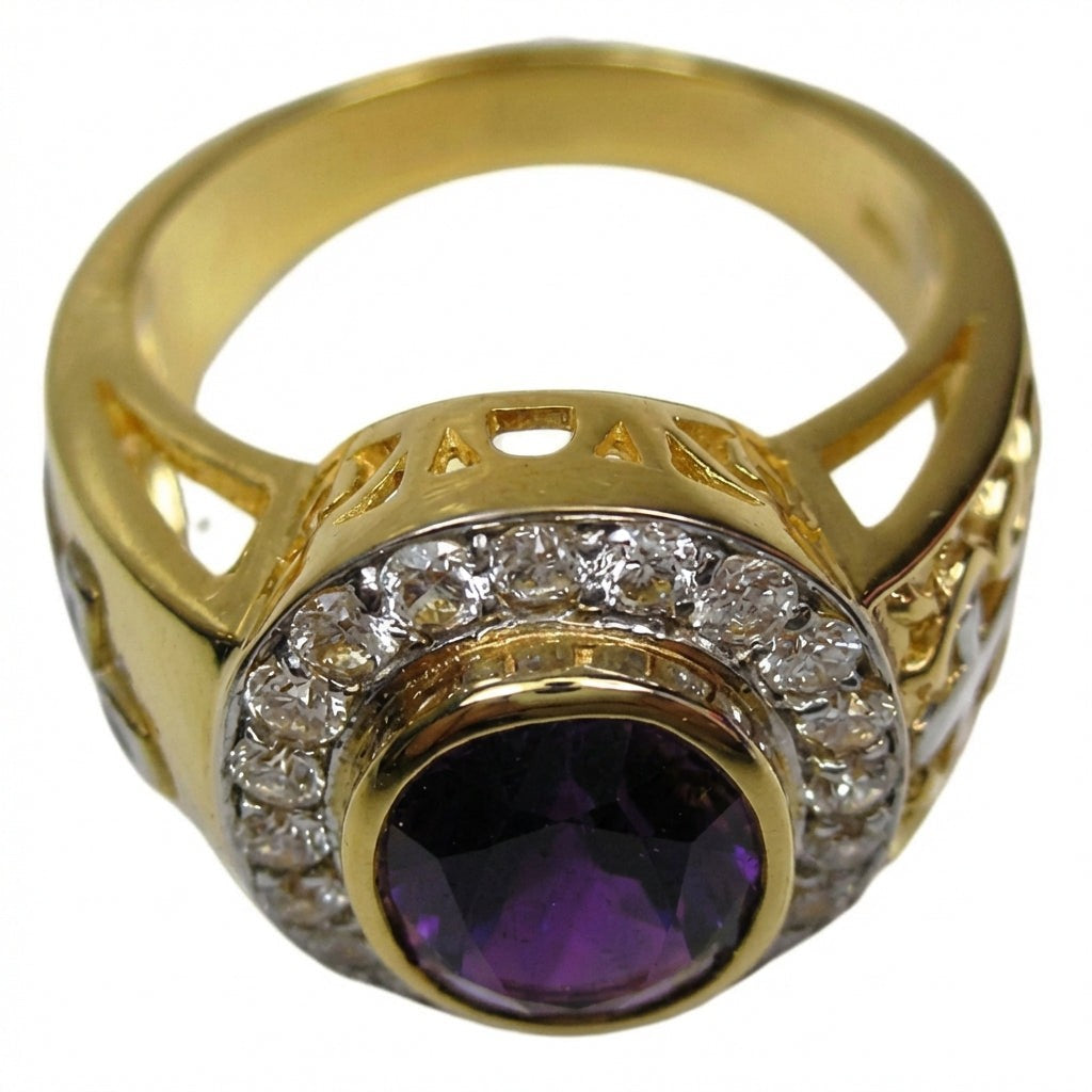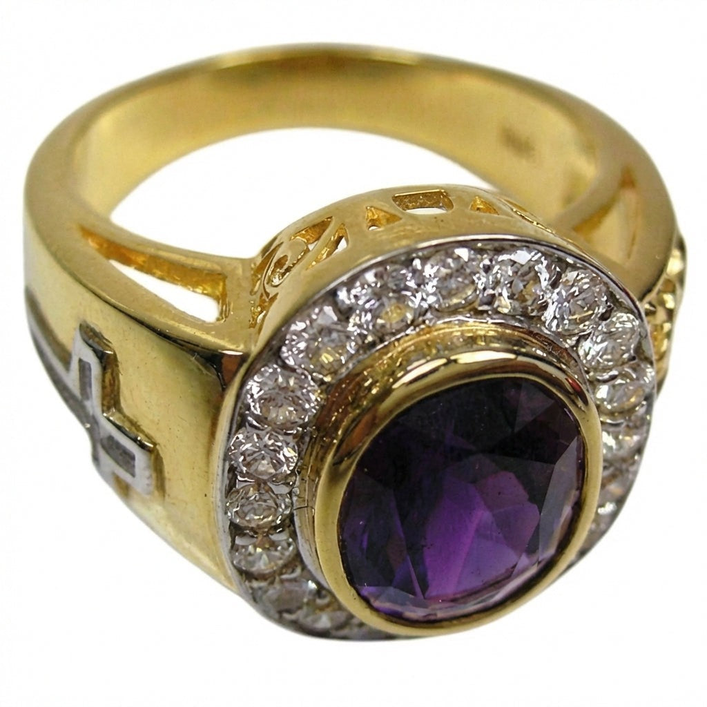 Korun kruunaa upea, ovaalihiottu ametisti. Kuningasmainen violetti ametisti, jota pidetään helmikuun syntymäkivenä, on istutettu kehysistutuksella ja sitä ympäröi säihkyvä kirkkaiden CZ-kivien kehä. Koko koru rakentuu täyshopeiselle pohjalle, jonka päälle on viimeistelty paksu 14k kultaus. Löydä lisää ainutlaatuisia uskon symboleita tutustumalla koko Christian Rings -mallistoomme.