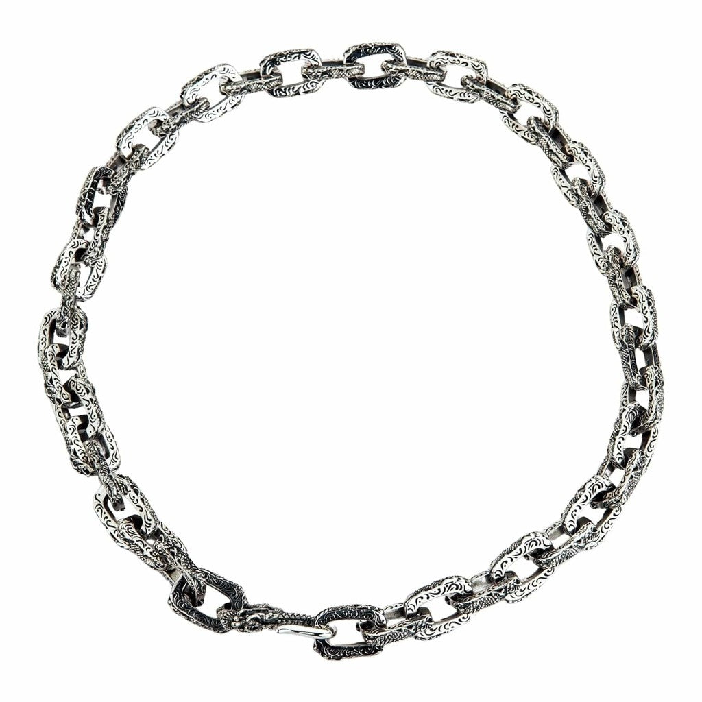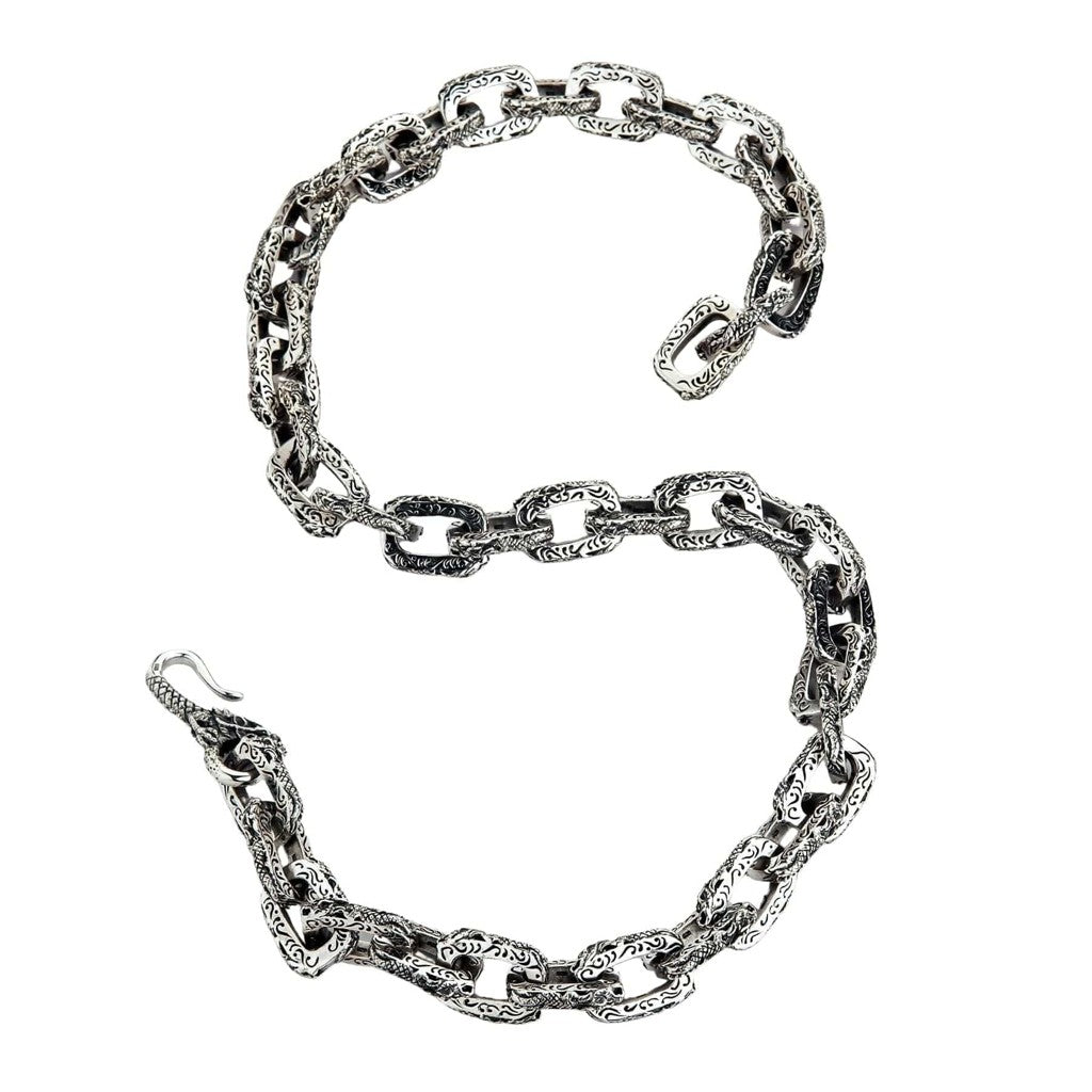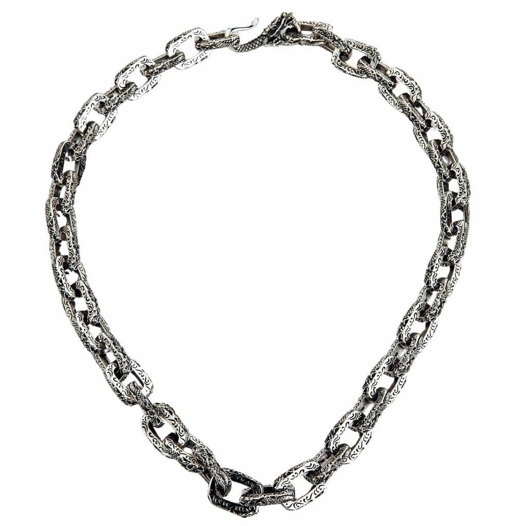 Itämaisessa mytologiassa lohikäärme on jumalallinen suojelija ja vaurauden tuoja. Tämä kaulakoru ilmentää tuota voimakasta legendaa. Jokainen paksu, painava lenkki on taidokkaasti kaiverrettu koristeellisilla, pyörteilevillä kuvioilla, jotka muodostavat pedon pitkän, mahtavan käärmemäisen vartalon. Matka kaulasi ympäri huipentuu näyttävään yksityiskohtaan: mestarillisesti viimeisteltyyn lohikäärmeen päähän, joka toimii jykevänä koukkulukona – turvana omaisuudellesi ja tyylillesi. Tämä ei ole vain kaulakoru, vaan suojelija, joka kiertyy ympärillesi.