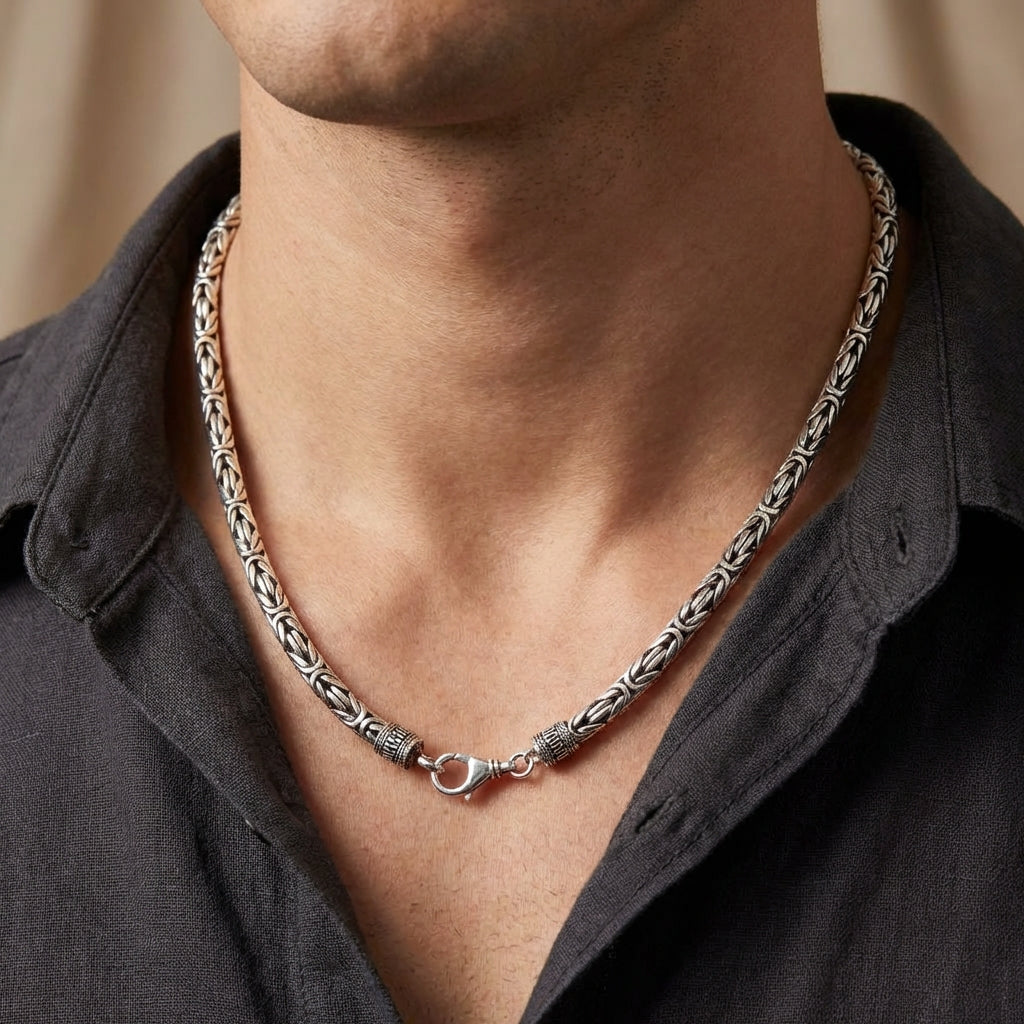 Luo vaikuttava läsnäolo raskaalla bysanttilaisella kaulaketjullamme, joka on hopeasepäntyön todellinen mestariteos. Massiivinen 7 mm paksuus ja yli 150 grammaa sterlinghopeaa – tämä ketju on miehelle, joka ei pyydä anteeksi tyyliään ja arvostaa perintölaatua. Se on enemmän kuin kaulakoru; se on voimakas osoitus vahvuudesta, ylellisyydestä ja ajattoman yksityiskohtaisesta muotoilusta.
