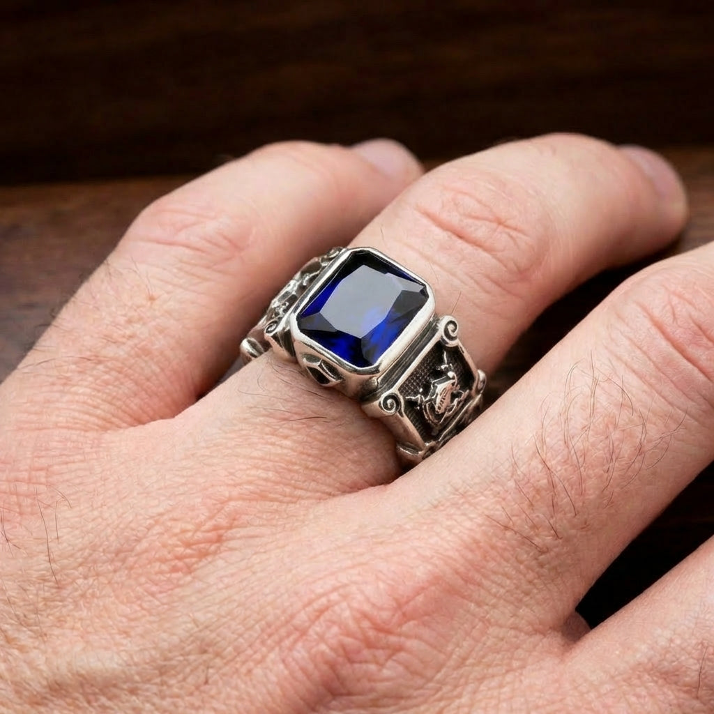 Varustaudu menneiden aikojen kunnialla ja rohkeudella tällä upealla ritarisormuksella. Mestarin taidolla massiivisesta .925 sterlinghopeasta taottu sormus on voimakas kunnianosoitus historian ja tarujen jaloille sotureille. Keskellä oleva syvänsininen jalokivi huokuu kuninkaallista voimaa – tämä ei ole pelkkä asuste, vaan rohkea ritarillisuuden, voiman ja horjumattoman suojelun symboli nykymiehelle.