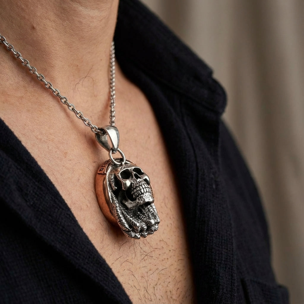 K: Millaisen kaulakorun kanssa tämä kannattaa yhdistää? V: Tämän riipuksen sekoitetut metallisävyt tekevät siitä hyvin monipuolisen. Se näyttää upealta yksinkertaisessa sterlinghopeaketjussa, joka korostaa kalloa, tai rustiikkisessa nahkanauhassa luonnollisempaa, maanläheistä tyyliä varten.