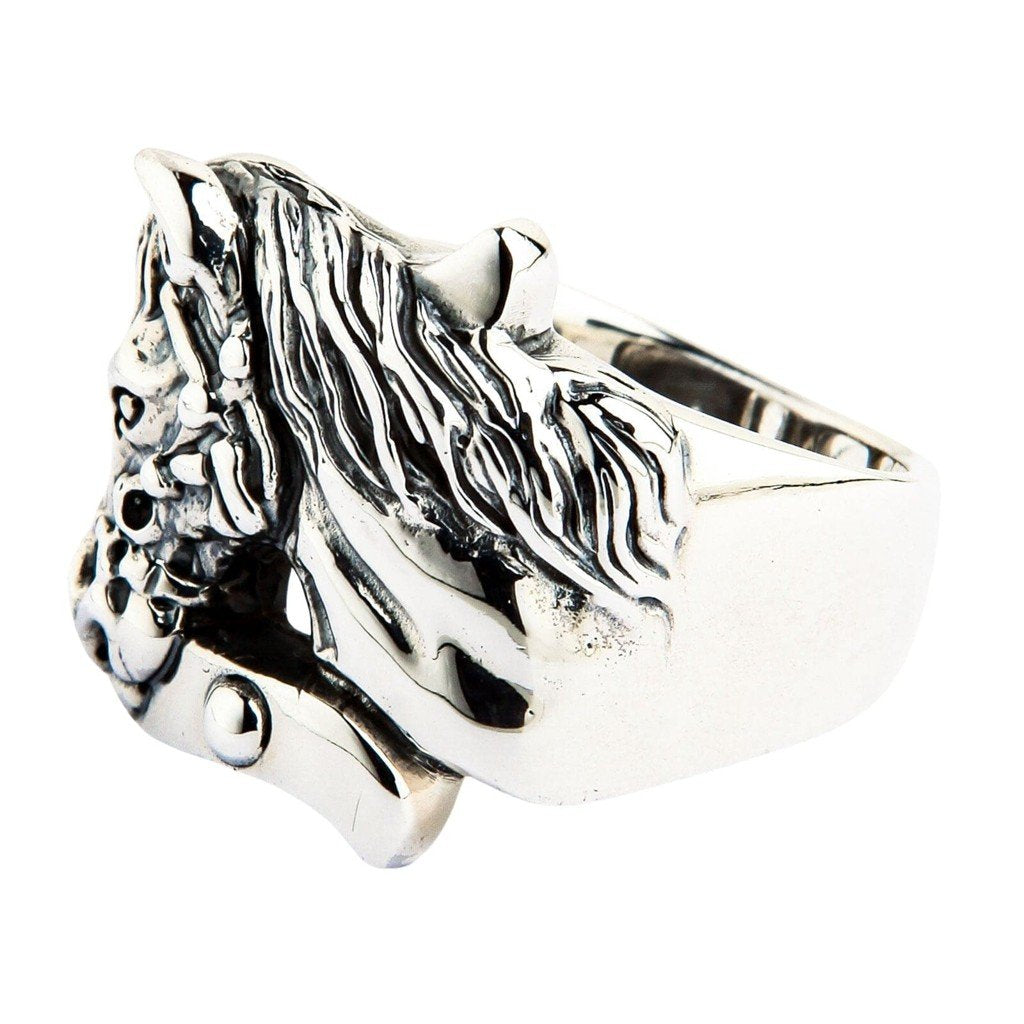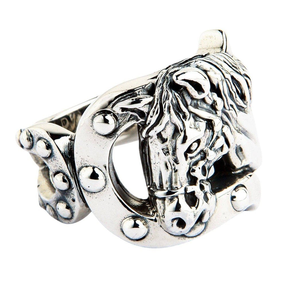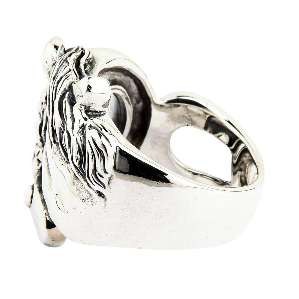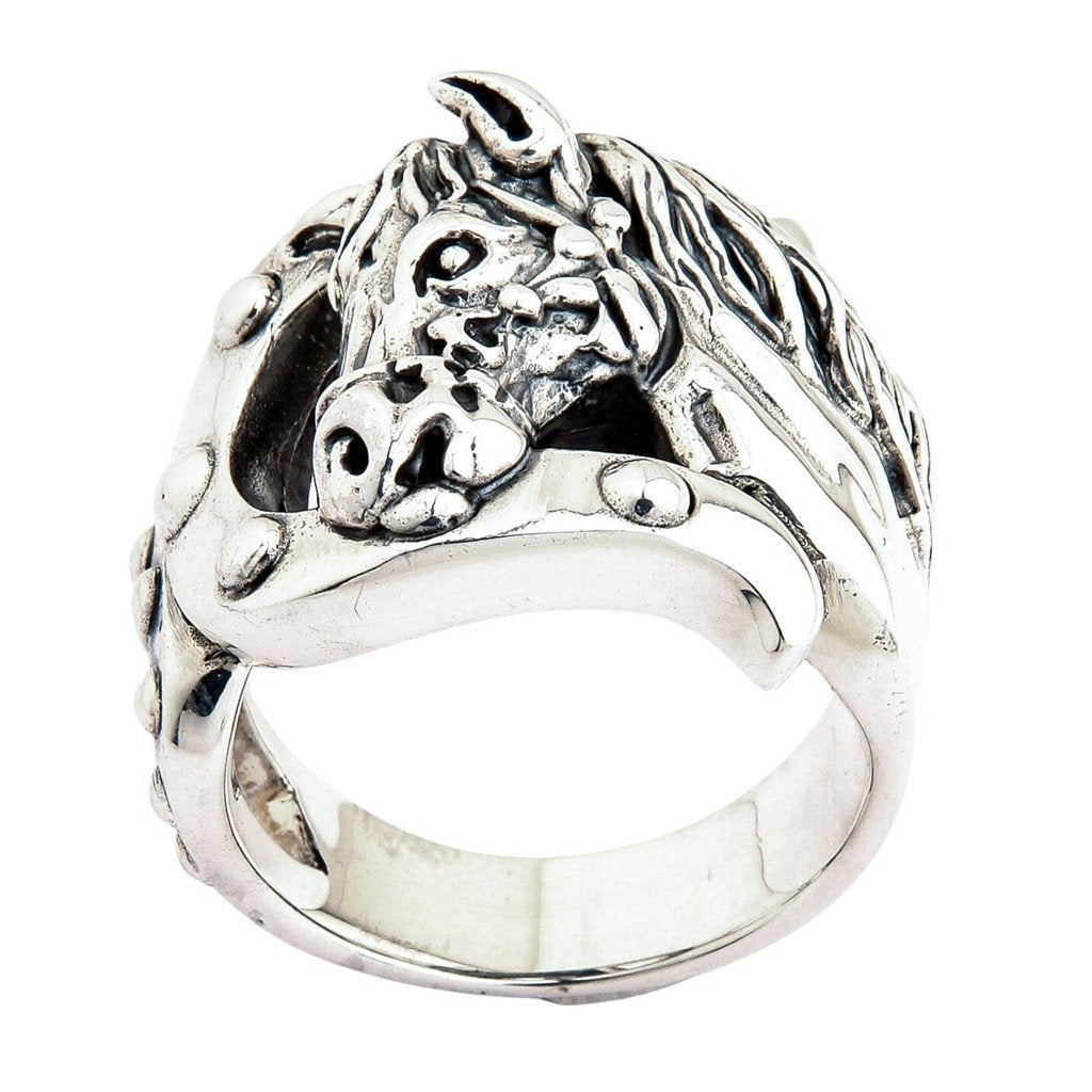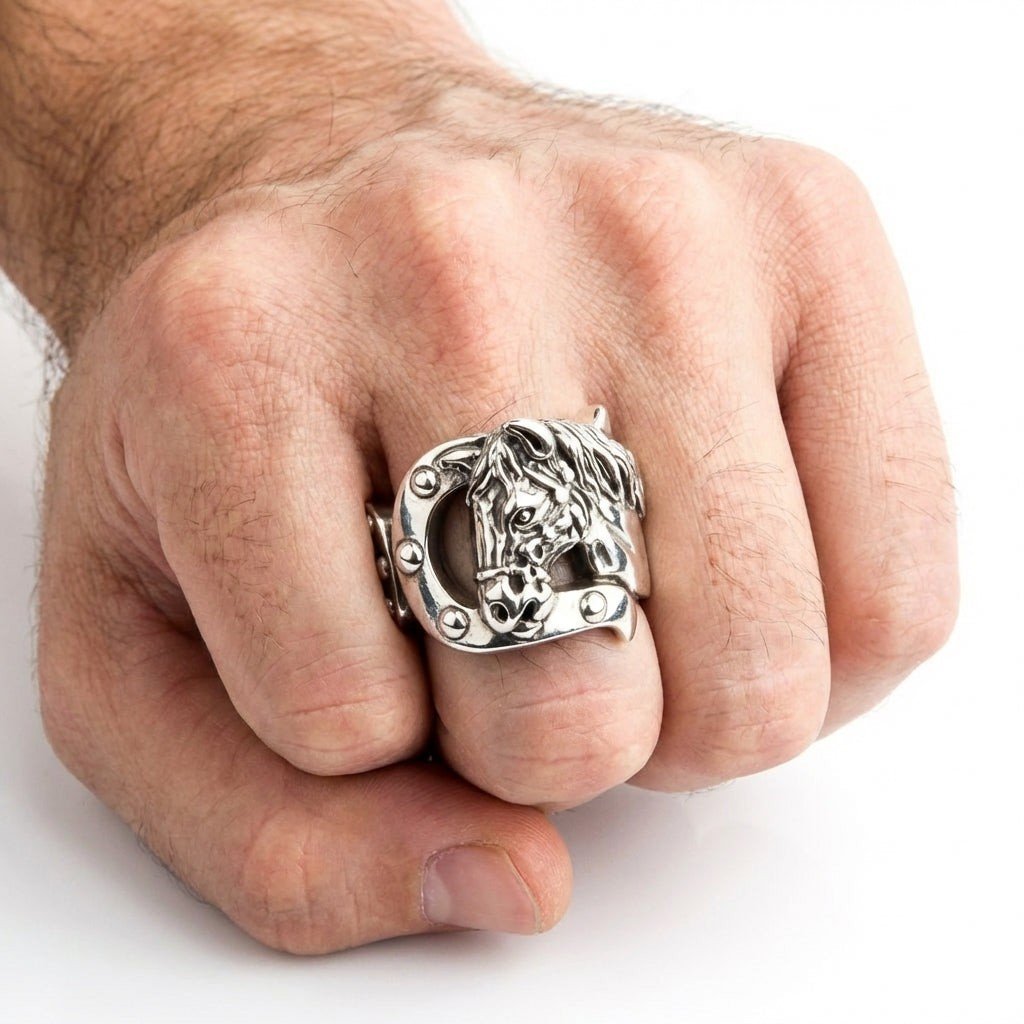 Jos ratsastusaiheiset mallit viehättävät, Keskiaikainen Hevonen & Hevosenkenkä Sormus tarjoaa koristeellisemman näkemyksen samasta teemasta massiivihopeasta valmistettuna.