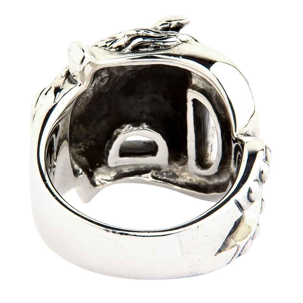 Hevosen pää lepää hevosenkengän muotoisen kehyksen sisällä — perinteinen ratsastussymboli yhdistettynä näyttäväksi koruksi. Tämä Rocker Horse -sormus on valettu massiivisesta .925 sterling-hopeasta, ja sen paino on 23 grammaa. Sormuksen 7/8" x 6/8" kokoinen kanta on keskikokoinen – tarpeeksi näyttävä herättämään huomiota, mutta silti miellyttävä sormessa. Harjan ja hevosenkengän kaaren jokainen ura on viimeistelty tarkasti ja kiillotettu huolella.