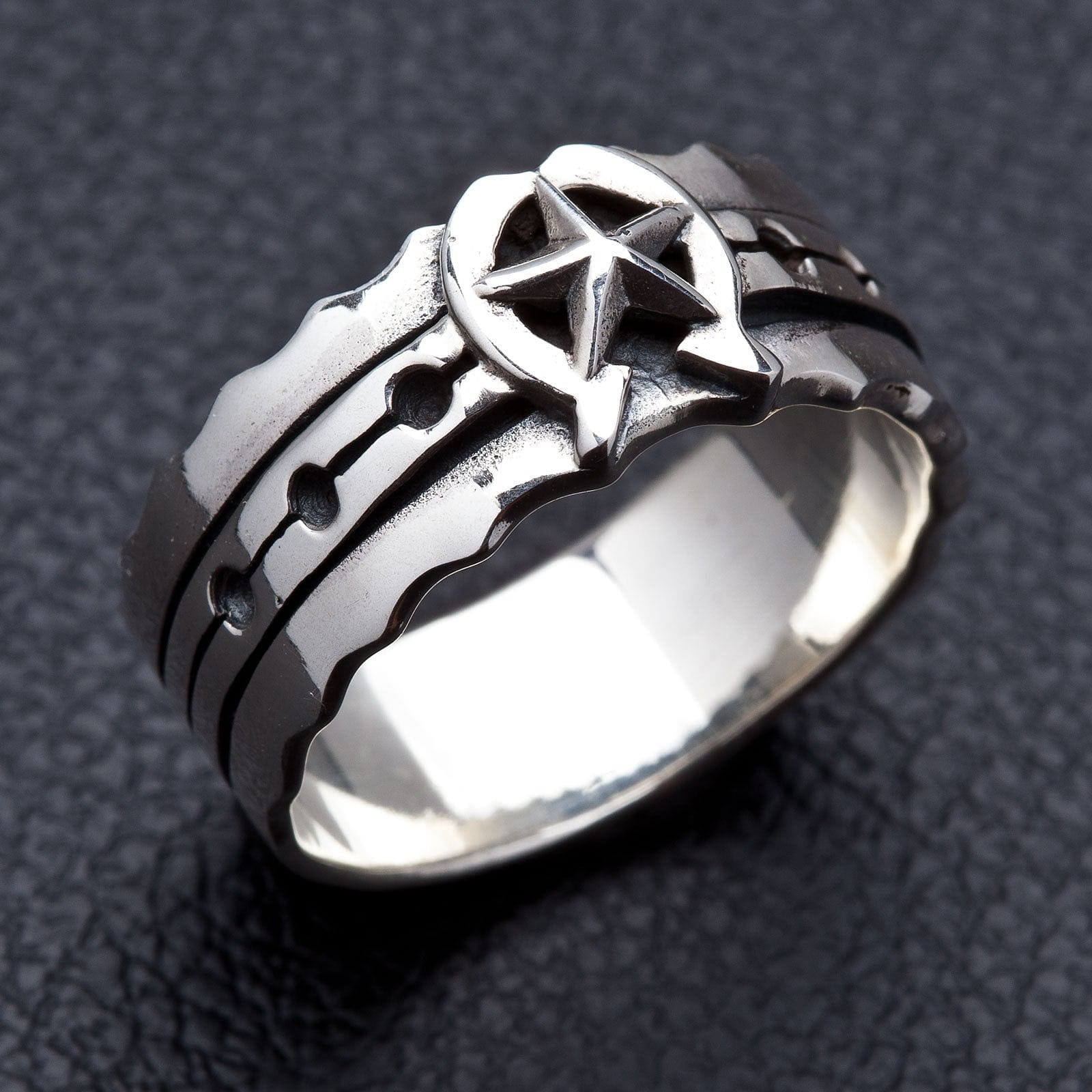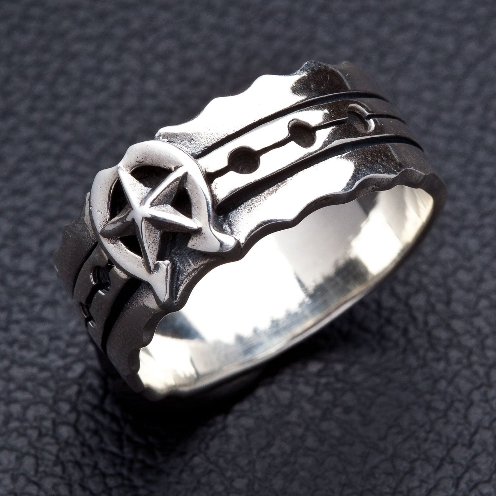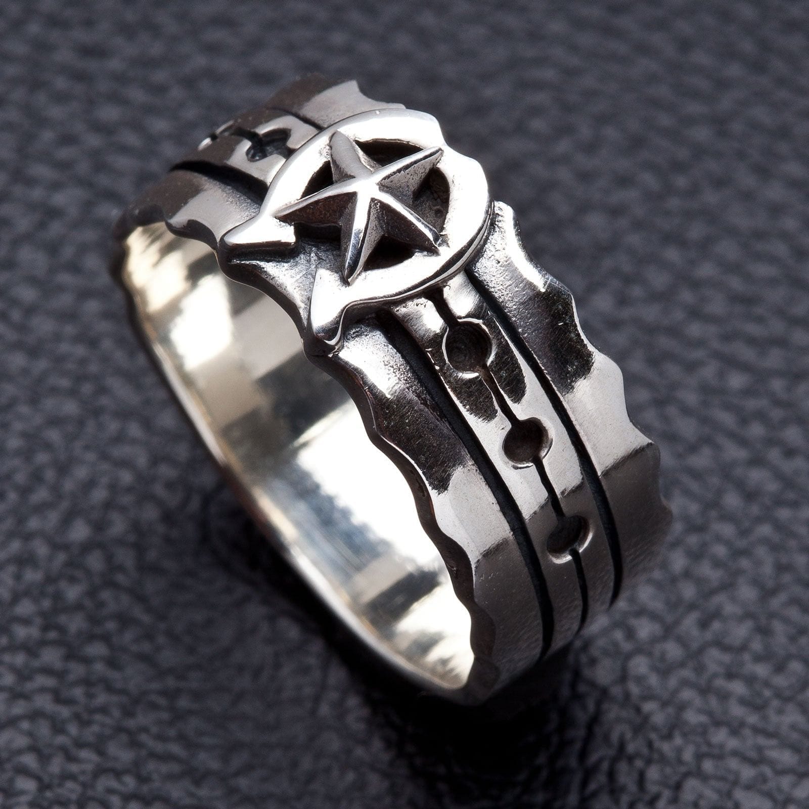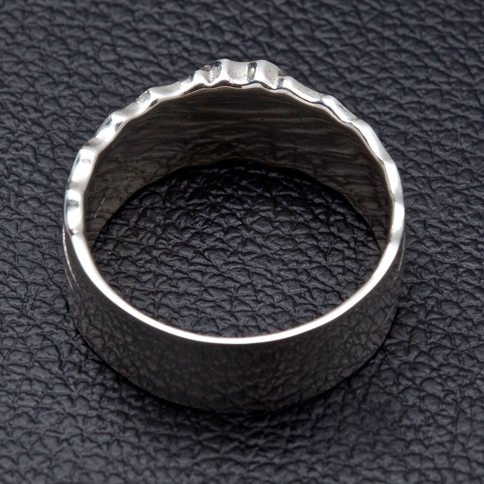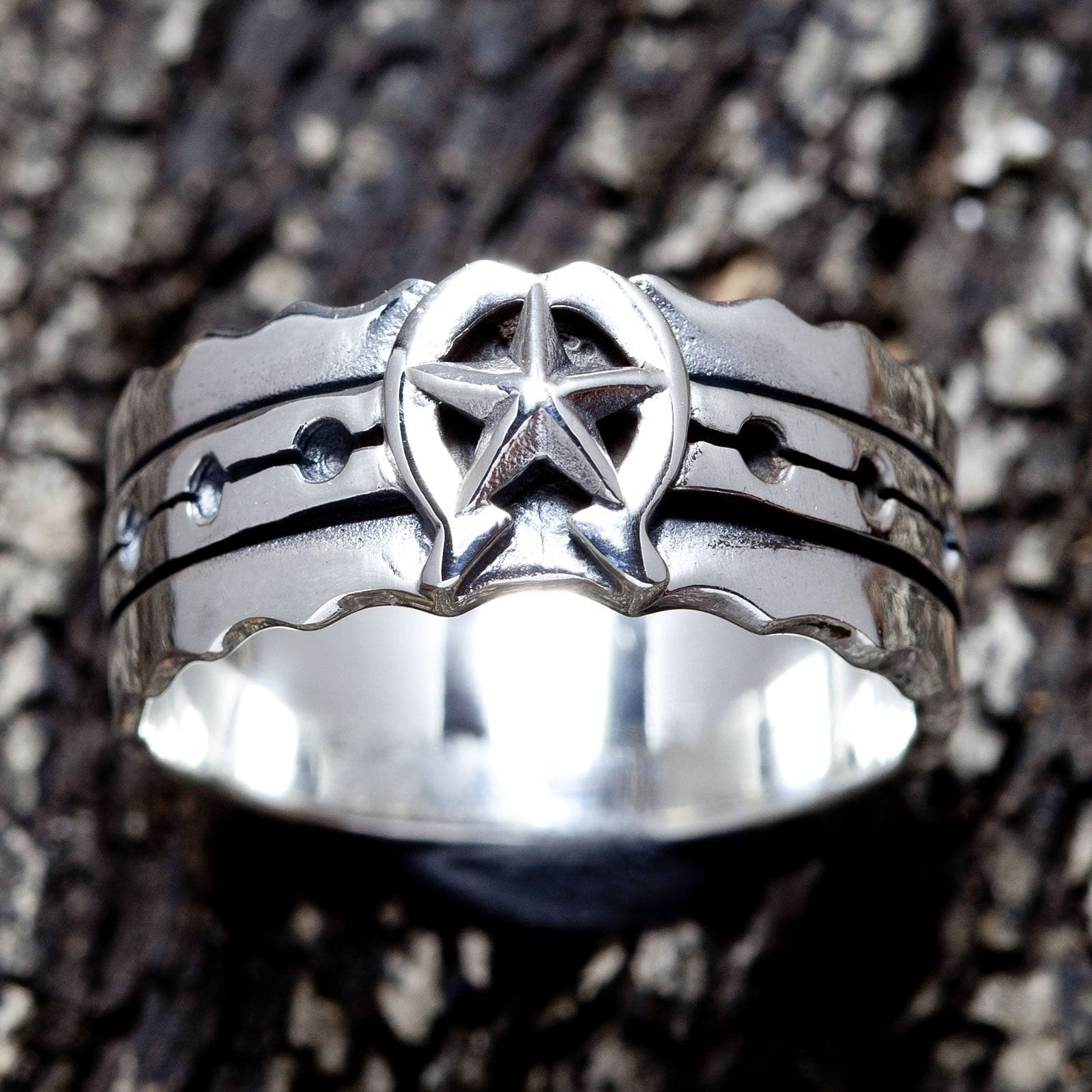 Tämän hopeasormuksen keskellä on näyttävä, kolmiulotteinen tähti – ajaton ohjauksen symboli ja kunnianhimo. Tähtiä kehystää klassinen hevosenkenkä, joka on vahva onnen ja suojelun symboli. Sormuksessa on ainutlaatuinen, rouhea ilme aaltoilevine reunoineen ja tummine, oksidoituine uurteineen – käsintehdyn cowboy-sormuksen tunnelma. Täydellinen western biker -koru jokaiselle oman tiensä kulkijalle.