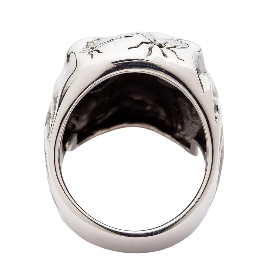 Tämä raskas hopeinen pääkallosormus on käsintehdyn taiteen mestariteos. Erittäin kiillotettujen pintojen ja tummien, oksidoitujen syvennysten välinen upea kontrasti tuo jokaisen synkän yksityiskohdan eloon. Sen huomattava paino tuntuu arvovaltaiselta sormessa – jatkuvana muistutuksena sen täyshopeisesta rakenteesta ja edustamastaan voimasta. Se on gangsterityylin korujen huipentuma, täydellinen jokaiselle vaikuttavien Biker Rings -sormusten keräilijälle ja Skull Rings -kokoelmamme kruunu.