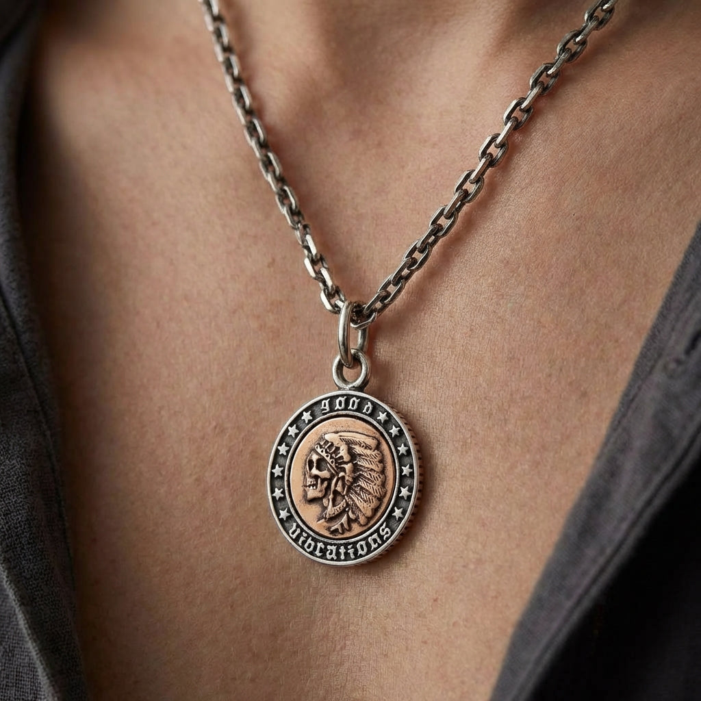 Tutustu ihmishengen syvään kaksinaisuuteen tällä ainutlaatuisella intiaanikallio-mitaliriipuksella. Tämä ei ole vain yksi riipus, vaan kaksi eri tarinaa yhdessä. Toinen puoli kunnioittaa soturihenkeä, toinen juhlistaa elämää ja iloa. Taidokkaasti käsintehty hopeasta ja kuparista, tämä käännettävä koru on kunnianosoitus Amerikan lounaisosan rikkaalle symboliikalle – täydellinen modernille motoristille, jolla on vanha sielu.