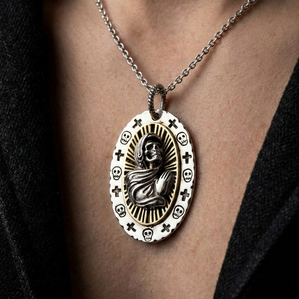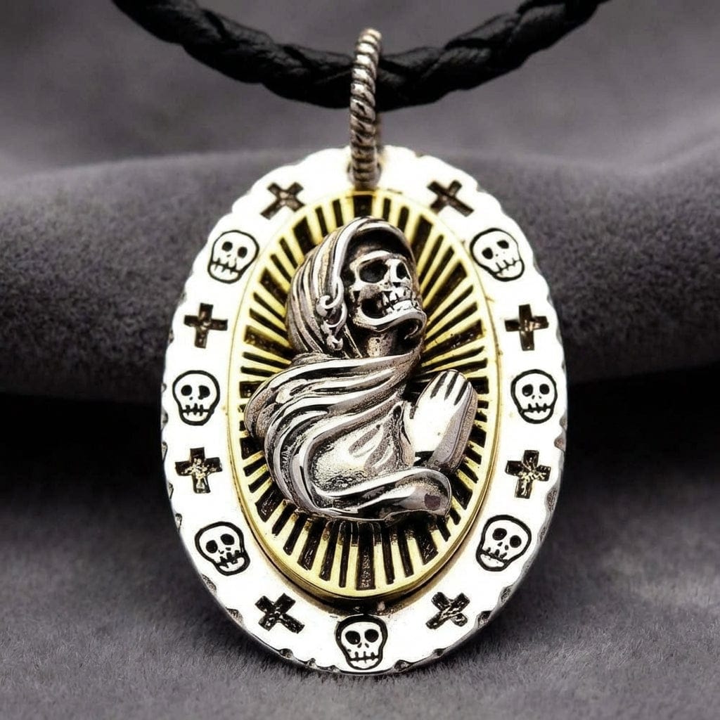 Tämä riipus on kaunis ja yksityiskohtainen uskonnollinen taideteos. Keskellä on Santa Muerte, voimakas Kuoleman Pyhimys, kuvattuna rukoilevana luurankona hopeiseen viittaan kietoutuneena. Taustalla loistaa säteilevä, kullanvärinen messinkinen sädekehä, kirkas auringonsäde, joka korostaa hänen pyhää ja arvostettua asemaansa. Koko soikeaa medaljonkia reunustaa koristeellinen kehys, jossa vuorottelevat kallo- ja risti-symbolit – ajattomat kuolevaisuuden ja uskon merkit.