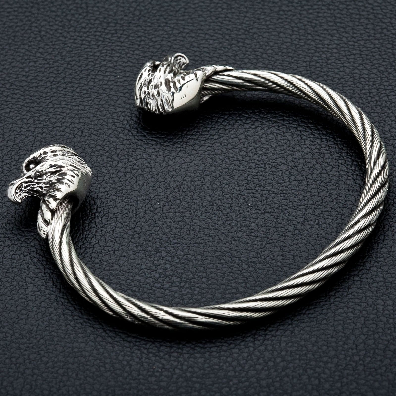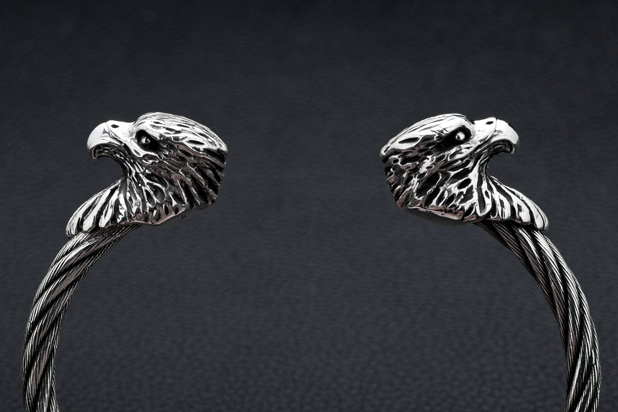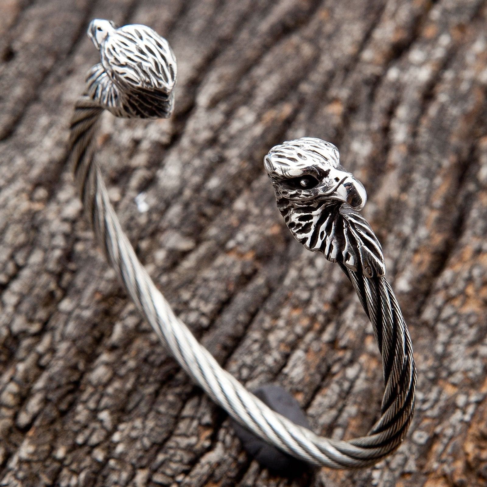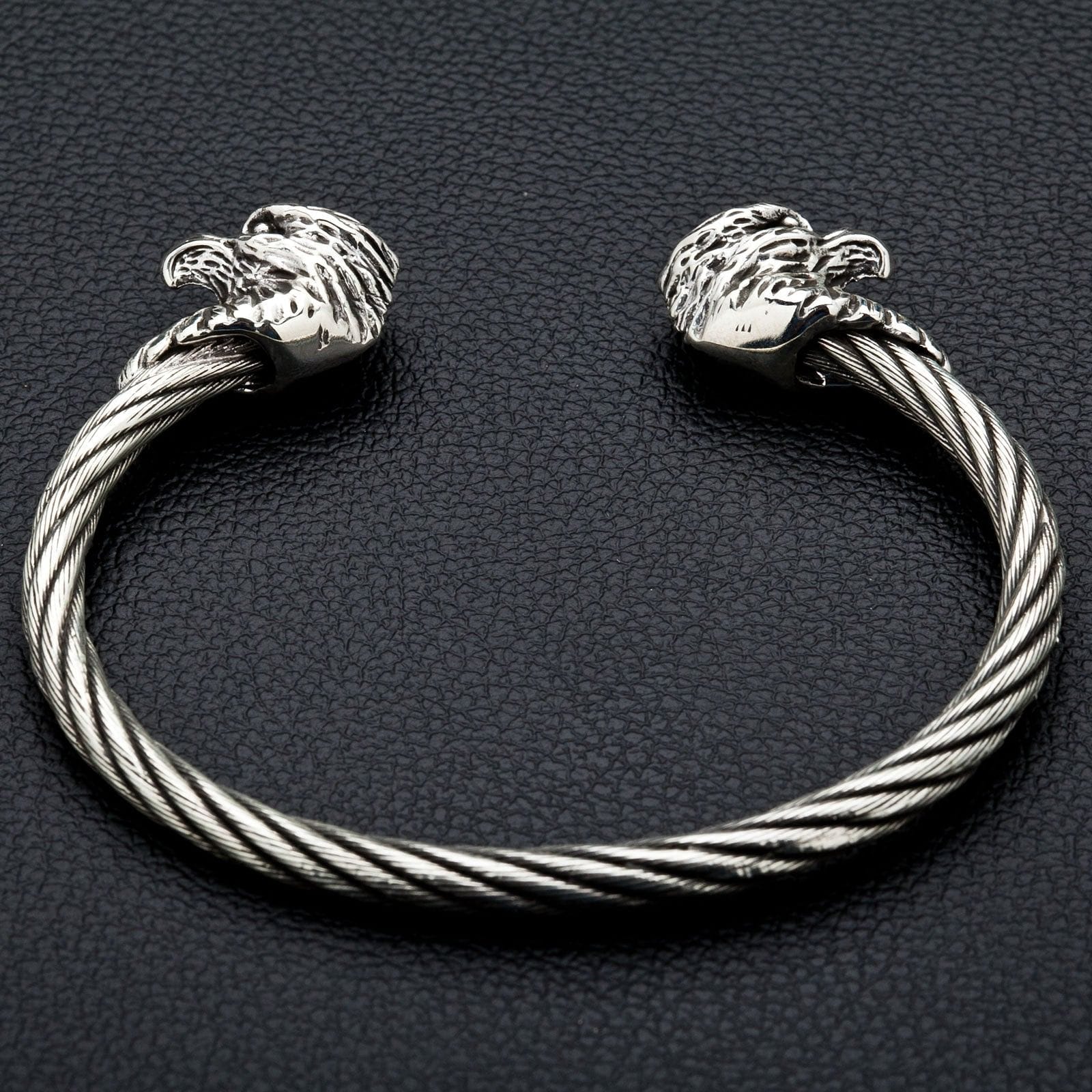 Tämän rannekorun nerokkuus piilee luonnollisen ja teollisen vahvassa yhdistämisessä. Rungon muodostaa paksu, tumma kierretty ruostumattomasta teräksestä valmistettu vaijeri, joka symboloi modernia voimaa ja murtumatonta päättäväisyyttä. Kummassakin päässä on virheettömästi kiillotetut kotkan päät, jotka on taidokkaasti valmistettu massivisesta 925 sterling-hopeasta uskomattoman yksityiskohtaisine höyhenineen. Upea kaksivärinen kontrasti yhdistää teräksen rouhean, tumman pinnan ja jalometallin kirkkaan loiston. Kaksoiskotkat, vapauden, rohkeuden ja tarkan näkemyksen ylivertaiset symbolit, seisovat ylpeinä ranteellasi. Painoa tällä avoimella, säädettävällä rannekorulla on vaikuttavat 44 grammaa, ja sen auktoriteettinen olemus sekä näkyy että tuntuu.