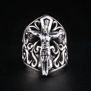 Jos usko on osa jokapäiväistä identiteettiäsi — Krusifiksi on sormuksen keskipiste, ei hienovarainen yksityiskohta. Kooltaan 1 ⅛" × 1 ½" se on huomioitava kaukaakin. Kilven muoto kehystää hahmon samalla tavoin kuin kirkon ikkuna kehystää näkymän — harkitusti, ei sattumalta.