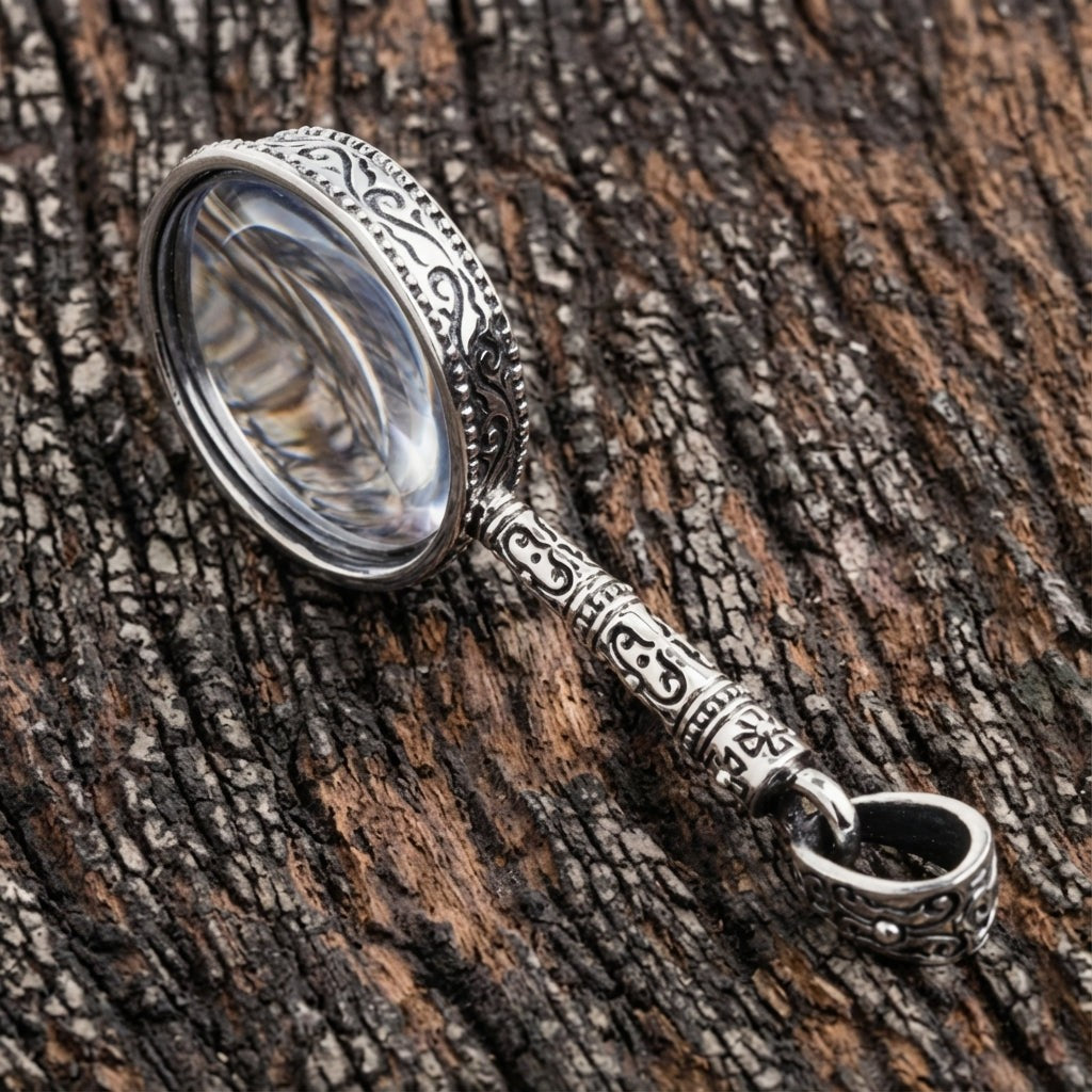 Nosta tyylisi uudelle tasolle näyttävällä goottityylisellä suurennuslasiriipuksellamme, joka on mestarillisesti käsintehty ensiluokkaisesta massiivisesta .925-hopeasta. Riipuksessa on yksityiskohtaiset gootti-vaikutteiset koristeet lasin ja kahvan ympärillä, mikä tekee siitä ainutlaatuisen katseenvangitsijan, jossa yhdistyvät eleganssi ja käytännöllisyys.