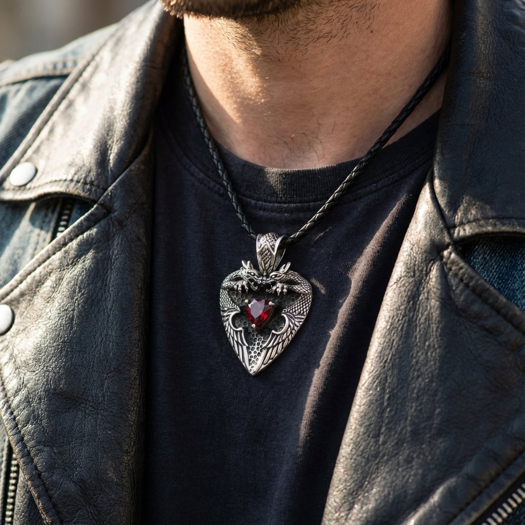 Tämä ei ole vain riipus, vaan aarre, jota myyttiset pedot vartioivat. Upea kaksoislohikäärmesydän-riipuksemme on tumman romantiikan mestariteos, voimakas symboli rakkaudesta, joka on sekä intohimoinen että suojeltu. Huolellisesti käsintehty jykevästä sterling-hopeasta, tämä koru on miehelle, jonka sydän on linnoitus, jota legendaarinen voima varjelee.