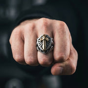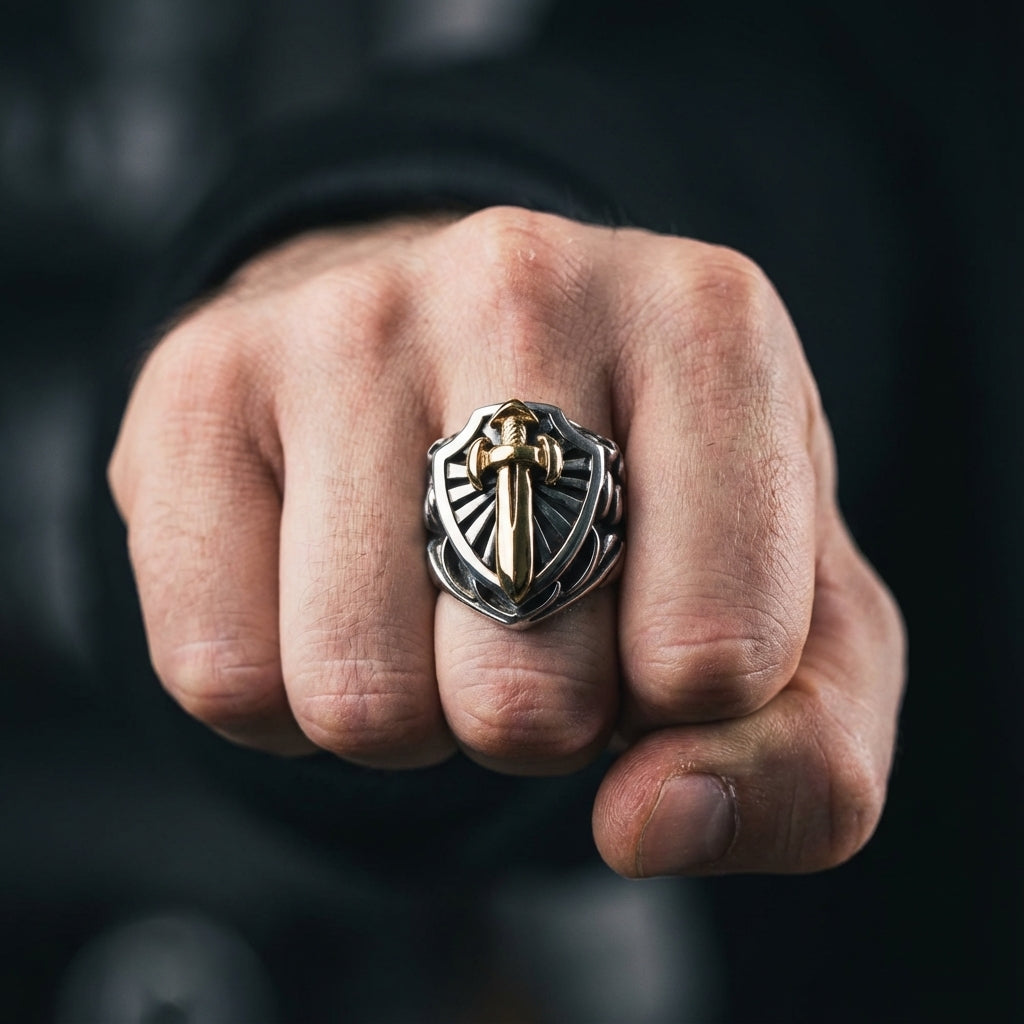 ⚔️ Symbolinen miekka & kilpi: Voimakas ritarisormus, jossa hopeinen kilpi edustaa suojaa ja kullattu miekka voimaa ja kunniaa, kiteyttäen täydellisen soturin koodin.