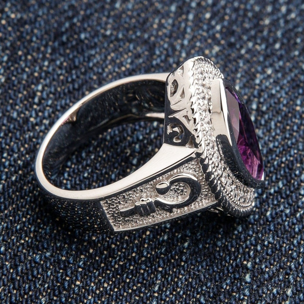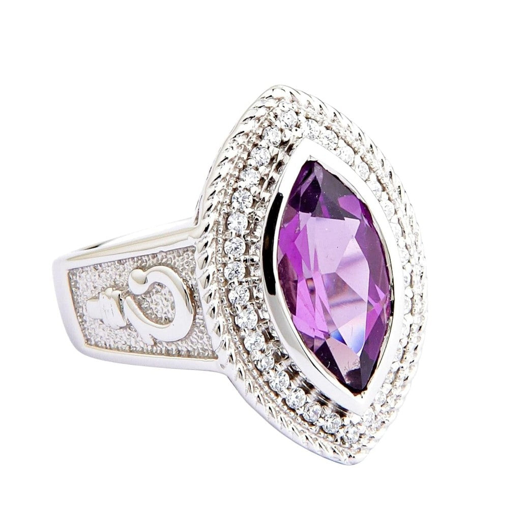 Sydämessä loistaa upea navettihiottu ametisti, jonka kuninkaallinen violetti sävy on pitkään liitetty aatelisuuteen ja intuitioon. Helmikuun perinteisenä syntymäkivenä tämän uskotaan tuovan kantajalleen mielenrauhaa ja suojaa. Kehystettynä säihkyvien sivukivien halolla ja valmistettuna täydestä hopeasta tämä on todellinen perintökoru, joka on suunniteltu merkittäväksi osaksi kokoelmaasi. Tutustu myös muihin sterlinghopeasormuksiimme ajattomien mallien löytämiseksi.