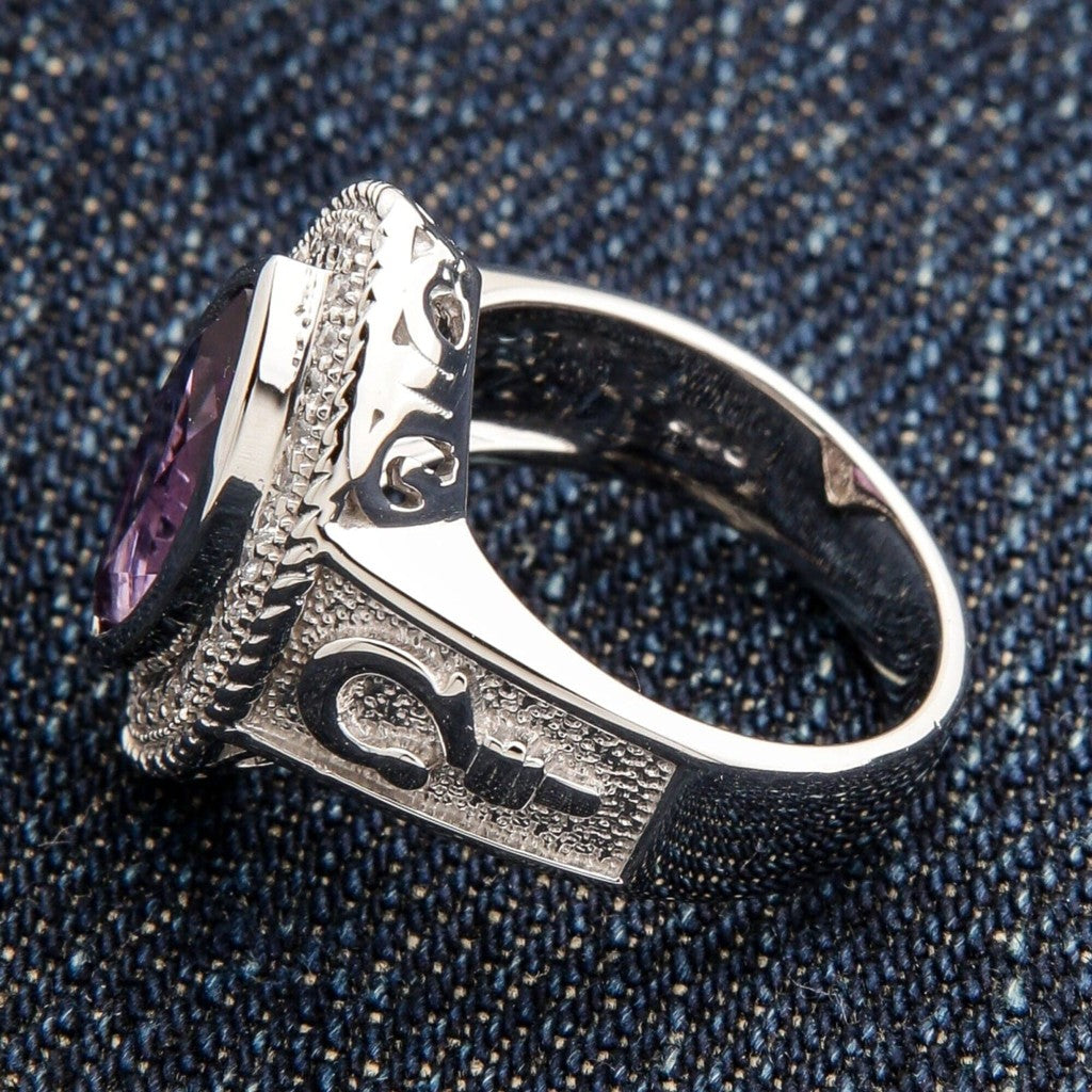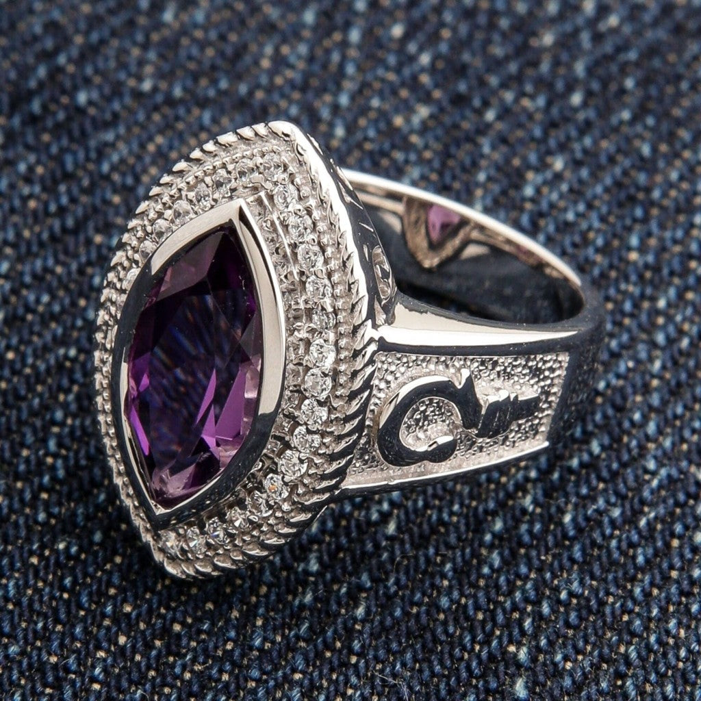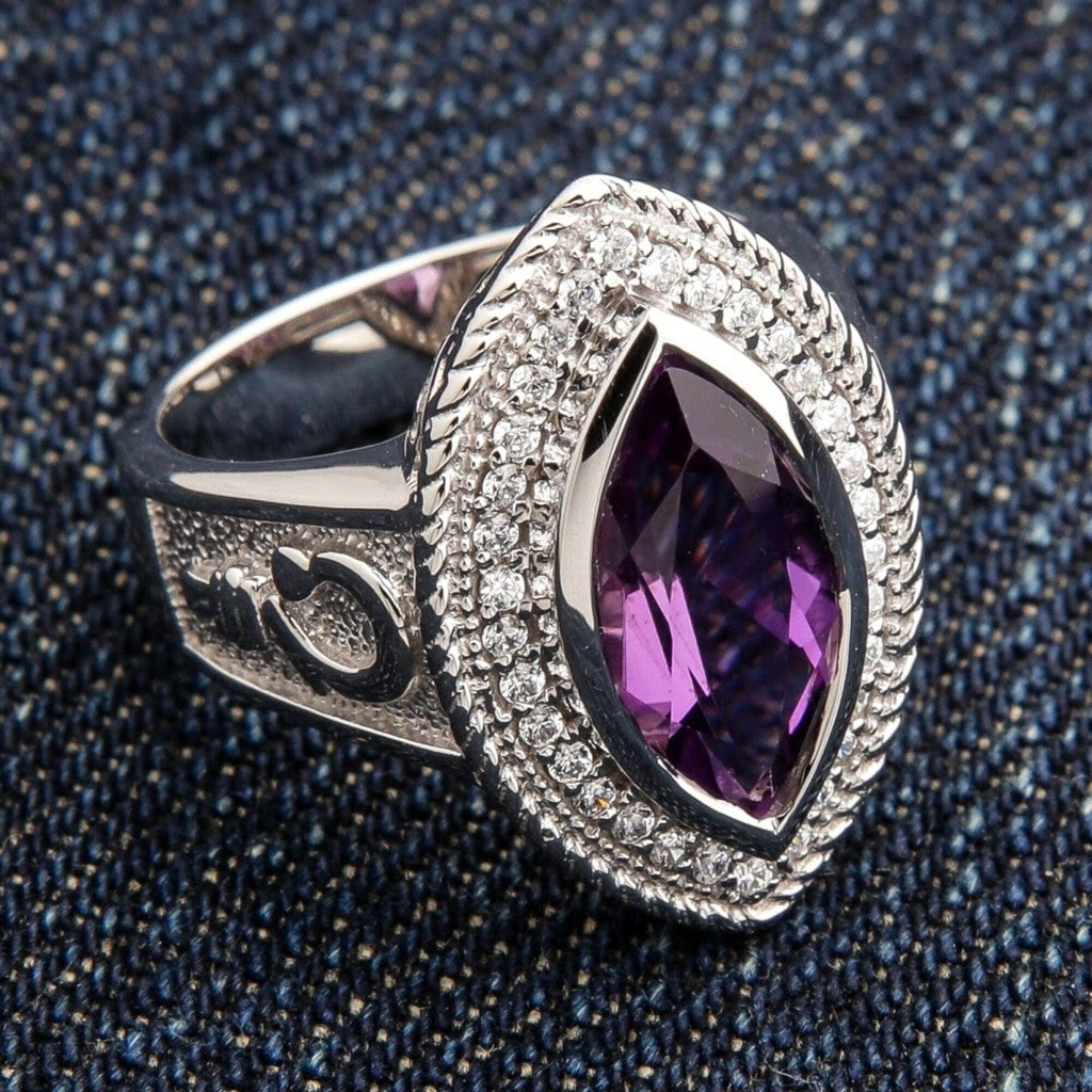 Säteile ajatonta arvovaltaa vangitsevalla naisten hopeisella piispasormuksellamme. Tämä mestarillinen kirkollinen koru on tunnistettavissa upeasta marquise-ametistista, joka on istutettu voimakkaaseen täyshopeiseen runkoon. Se on enemmän kuin pelkkä asuste; se on rohkea viisauden ja tyylin osoitus, huolellisesti valmistettu naiselle, joka johtaa arvokkaasti.