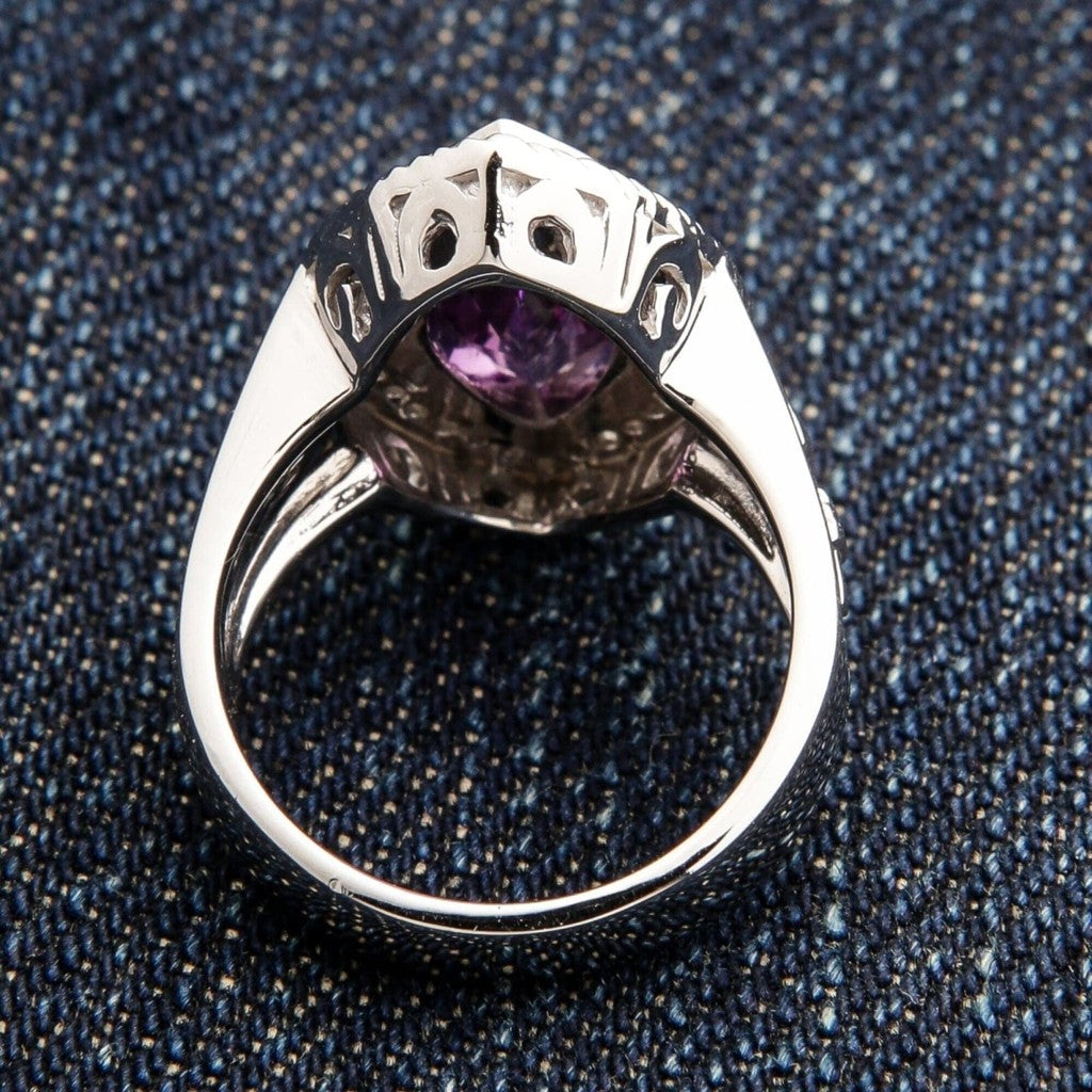 💎 Majesteettinen Keskikivi: Upea 6 mm x 14 mm luonnollinen marquise-hiottu ametisti, joka on valittu syvän värinsä ja elegantin, sormea imartelevan muotonsa vuoksi.