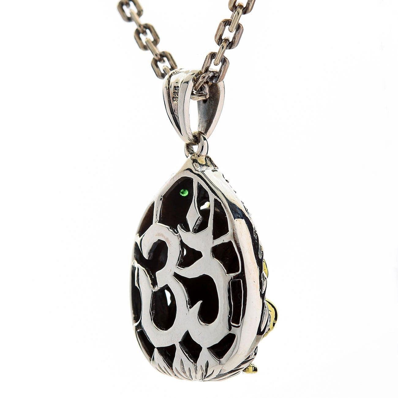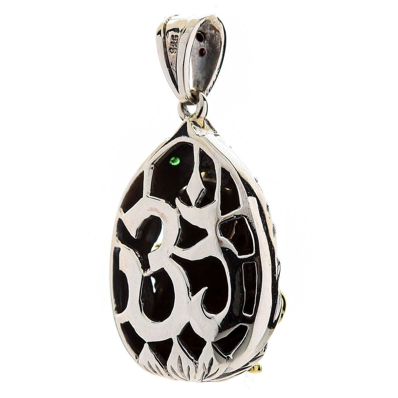 Retournez ce pendentif représentant un dieu hindou et découvrez un second symbole spirituel : une découpe nette et polie du symbole « Om » (Aum) . Cela en fait un pendentif Om Ganesh parfait, alliant la capacité à supprimer les obstacles à la voix de toute création. La bélière est également soigneusement décorée de pierres précieuses assorties.