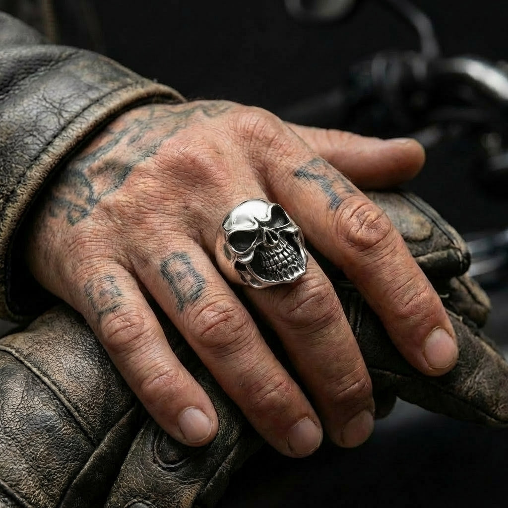 Si vous roulez quotidiennement — l'intérieur de l'anneau est lisse pour ne pas accrocher dans les gants, et ses dimensions de 21mm × 25mm permettent un profil bas qui ne gêne pas le maniement des leviers de frein. L'argent sterling résiste à la transpiration et aux vibrations de la route sans se fissurer ni se déformer. Idéal pour les motards exigeant des bijoux tête de mort qui n'entravent pas la conduite.