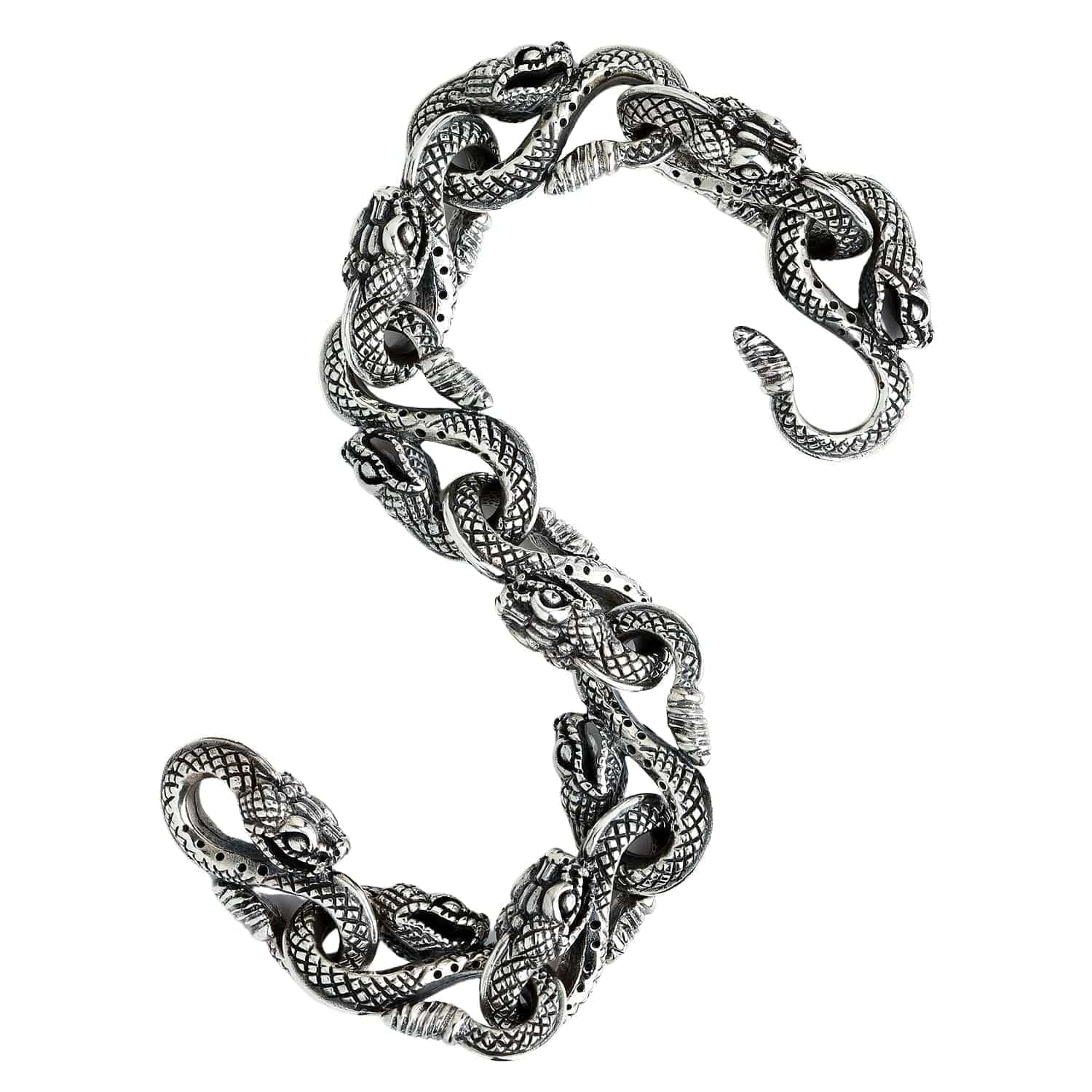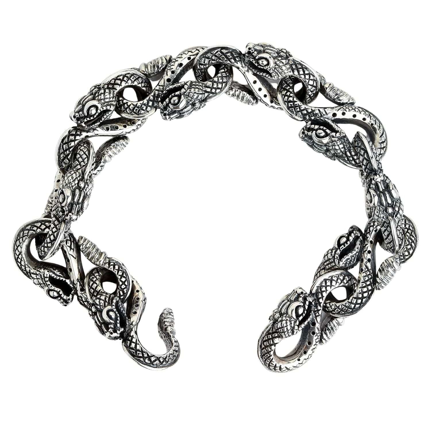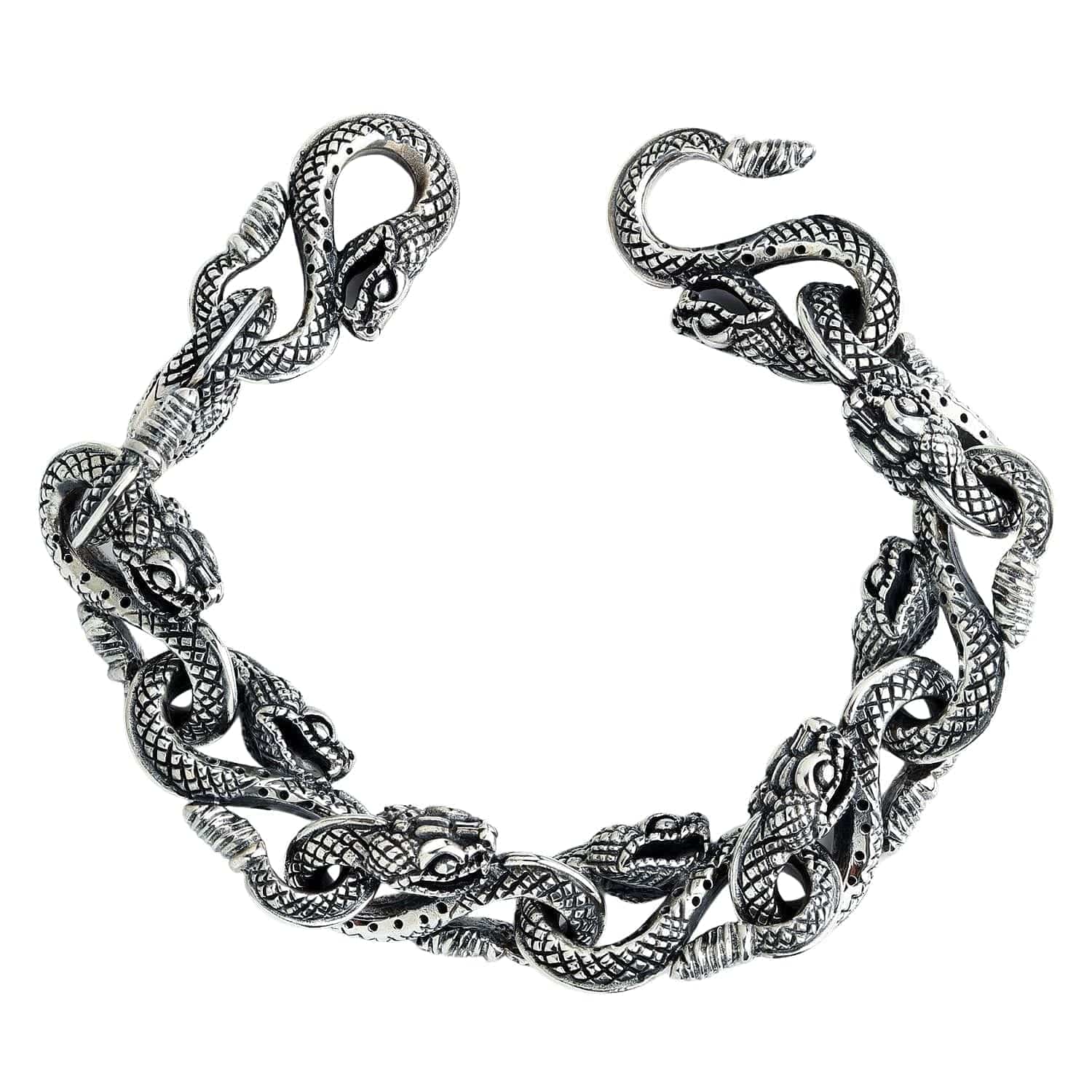 Ce bracelet est un chef-d'œuvre d'artisanat artisanal . Oubliez les maillons classiques ; ce bracelet est entièrement composé de têtes de serpent entrelacées . Chaque serpent est méticuleusement sculpté d'écailles détaillées, sublimées par une finition oxydée foncée qui lui confère un esprit gothique profond. Son design épuré se termine par un fermoir mousqueton personnalisé où la tête d'un serpent s'accroche à la queue d'un autre, complétant ainsi le cercle de la renaissance.