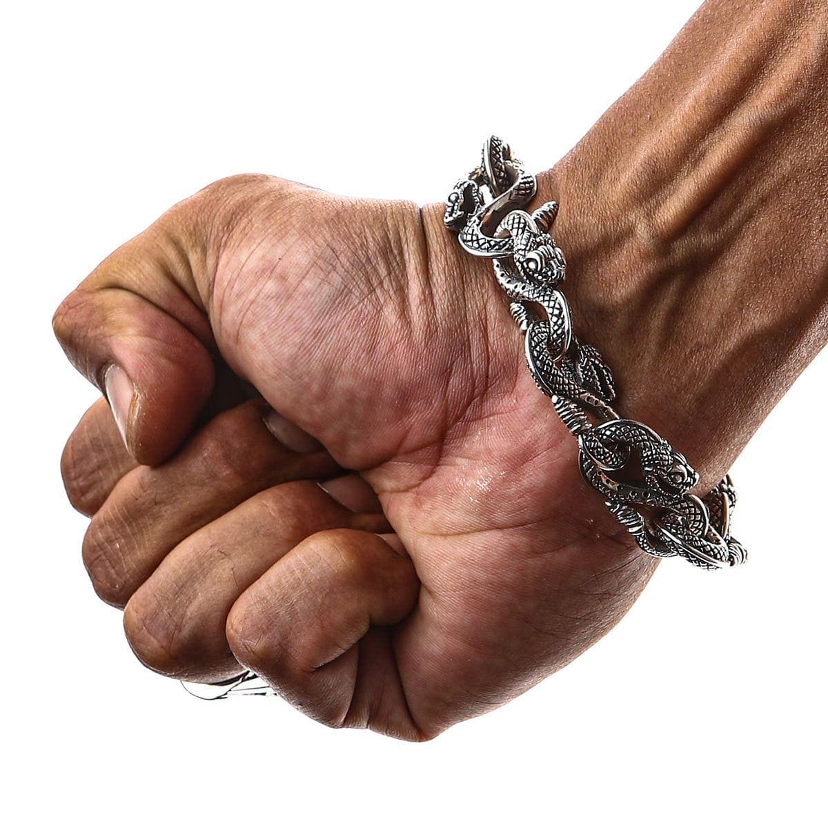 Affirmez votre intensité. Ce n'est pas un simple bracelet ; c'est une œuvre d'art massive de 94 grammes . Forgé en argent sterling 925 massif, notre bracelet à maillons serpent est idéal pour ceux qui recherchent des accessoires d'une grande valeur. Ce bracelet serpent pour homme puissant évoque la transformation et la puissance brute.
