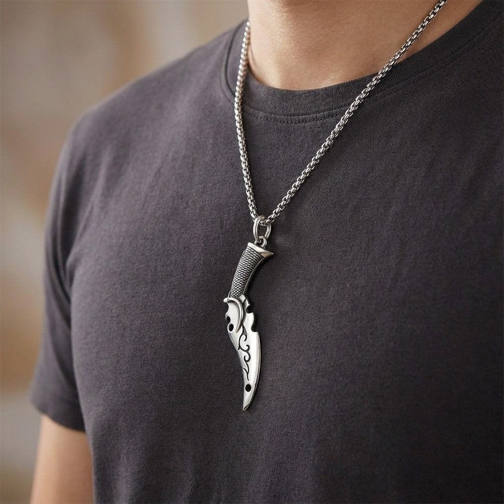 Prêt à affûter votre style au quotidien ? Notre pendentif couteau en argent massif, inspiré de la lame tribale, incarne la virilité brute et le savoir-faire d'exception. Conçu pour celles et ceux qui n'ont pas peur d'affirmer leur personnalité, ce bijou structure votre look grâce à la robustesse de l'argent massif et à l'esthétique puissante d'un talisman de guerrier . Bien plus qu'un simple bijou, c'est une déclaration de force qui rehausse instantanément n'importe quelle tenue, qu'elle soit de motard ou gothique.