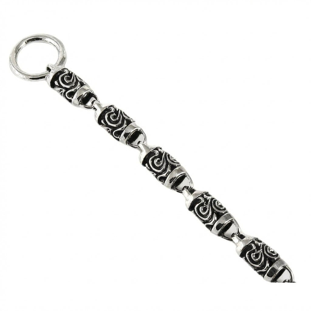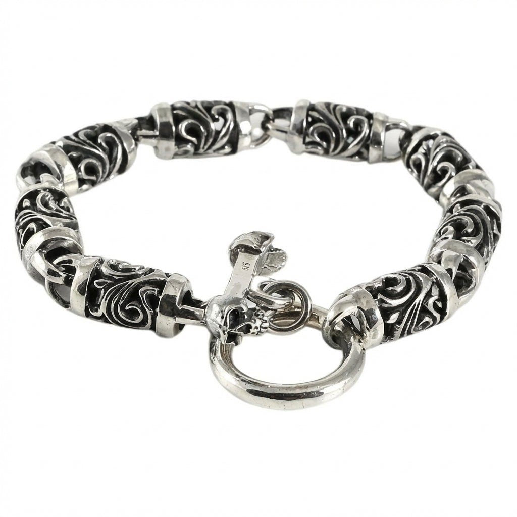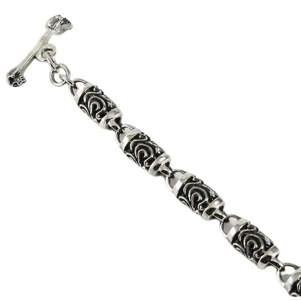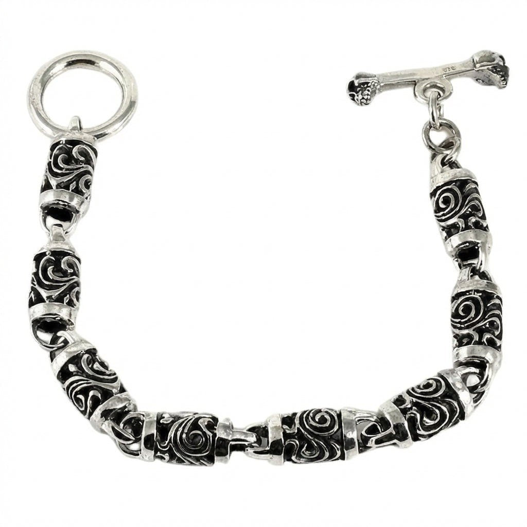 Les perles de ce bracelet ne sont pas fixes : chacune pivote librement entre ses axes de connexion. Faites-en rouler une entre votre pouce et votre index : les volutes tribales sculptées tournoient alors que le bracelet reste stable sur votre poignet. Le bracelet Tribal Roller pèse 50 g d'argent sterling .925 massif, mesure 10mm de large et est sécurisé par un fermoir barre en T tête de mort, aussi détaillé que les perles elles-mêmes.