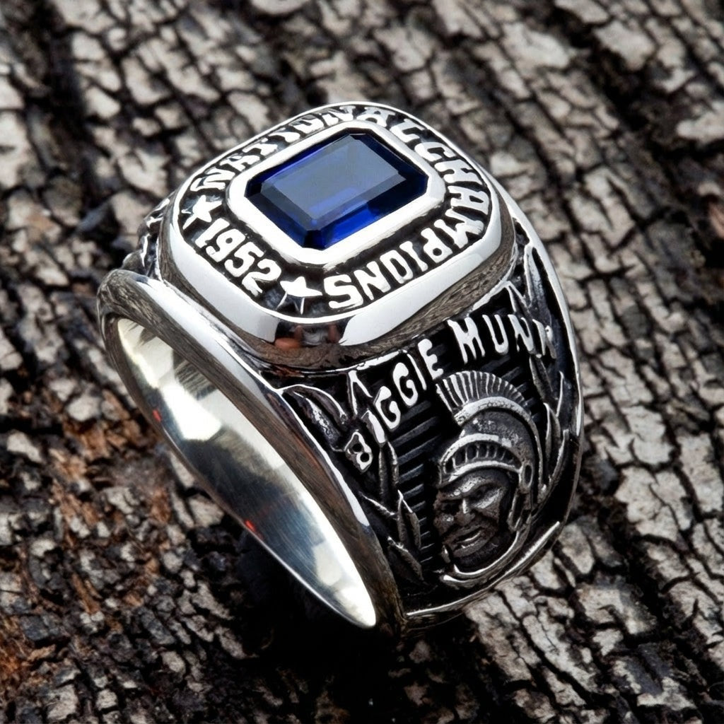This college championship ring is a faithful, detailed recreation of the 1952 classic. The top features a large, emerald-cut red Cubic Zirconia stone, encircled by the words "NATIONAL CHAMPIONS 1952." One side proudly displays "MICHIGAN STATE" with the iconic "S" logo. The other side honors the legendary coach, "Biggie" Munn, alongside the fierce Spartan mascot. The deep, oxidized details make every element of this football ring stand out.
