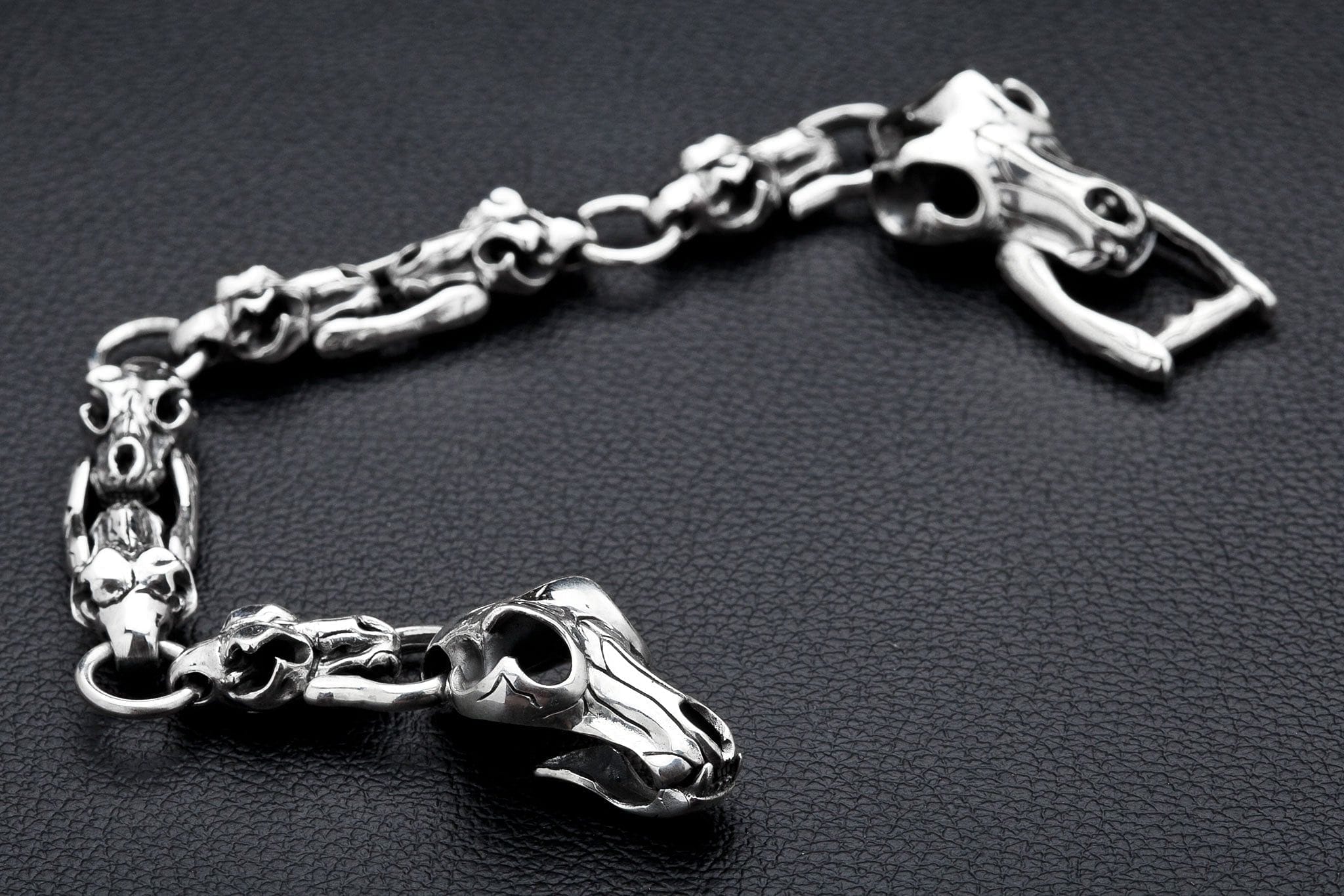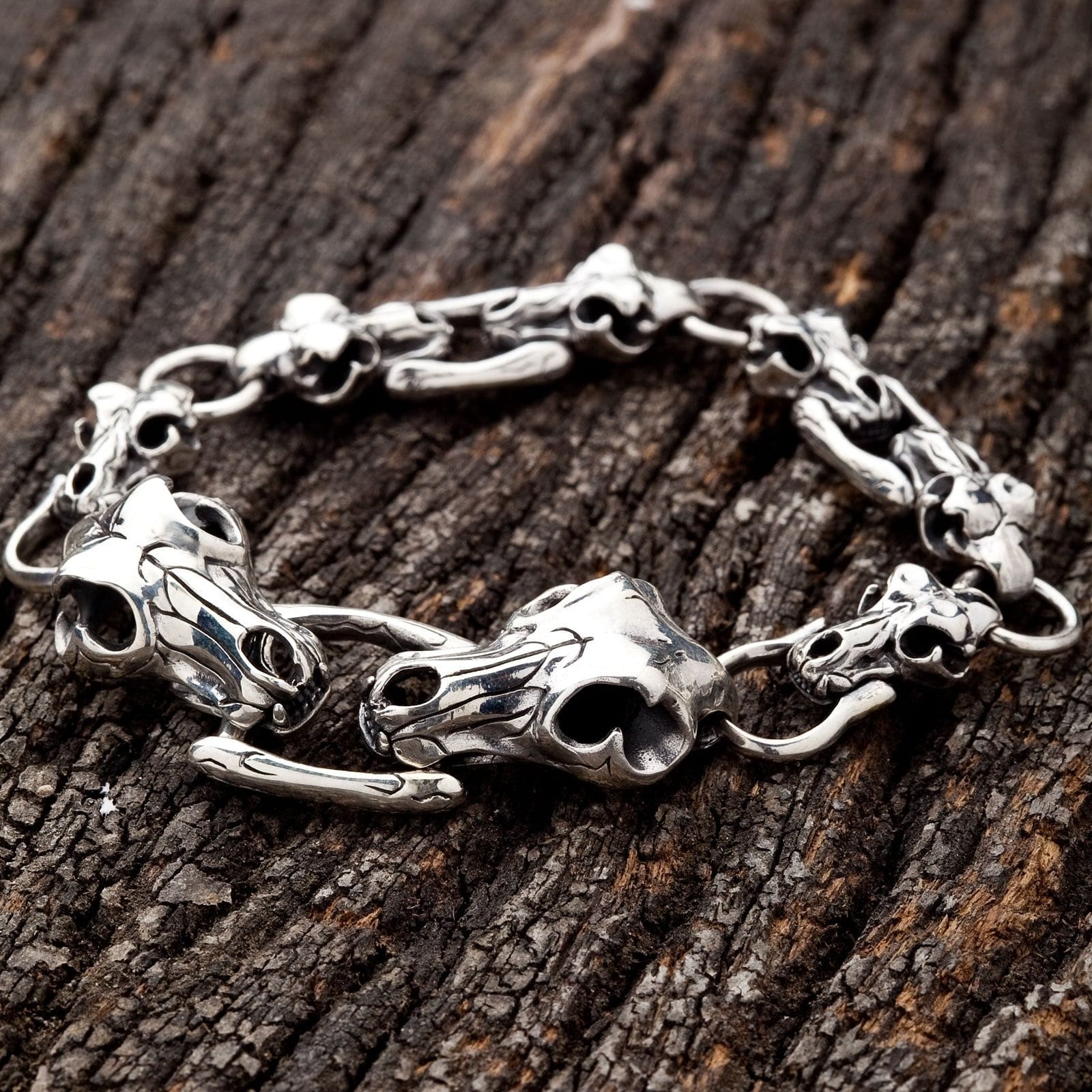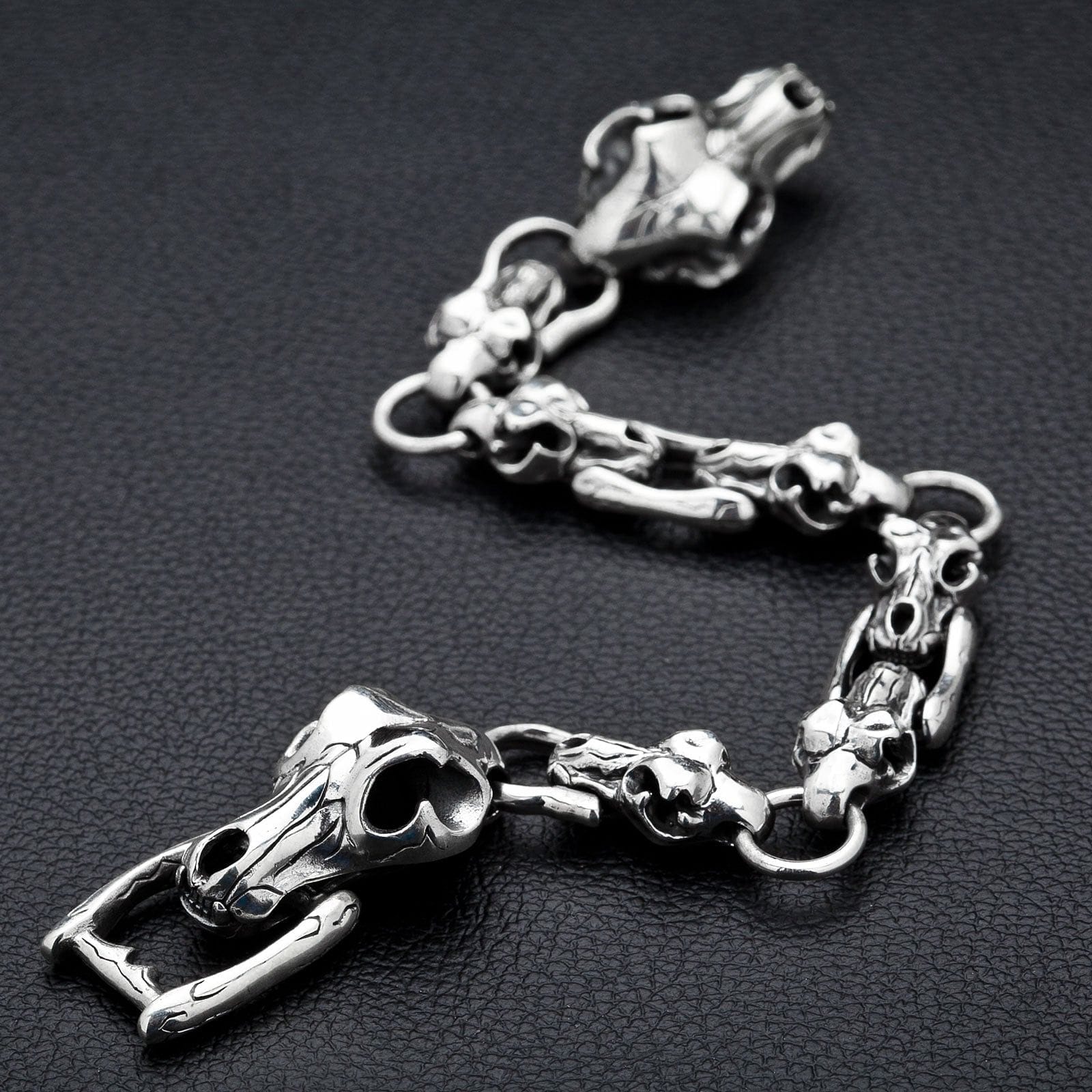 This is not just a bracelet; it's a boneyard for your wrist. Our incredible animal skull bone bracelet is a masterpiece of primal art, a tribute to the raw, untamed cycle of life and death. Forged from a colossal weight of solid sterling silver, this is the ultimate statement piece for the modern savage, the hunter, and the man who understands that power is a force of nature.