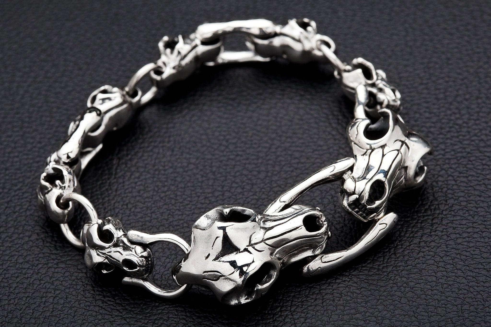 4. Is the bracelet handmade? Yes. Each unique skull and bone link is individually cast and finished, and the entire bracelet is hand-assembled and polished by a skilled artisan. This ensures a level of detail and quality that is unique to handcrafted jewelry.