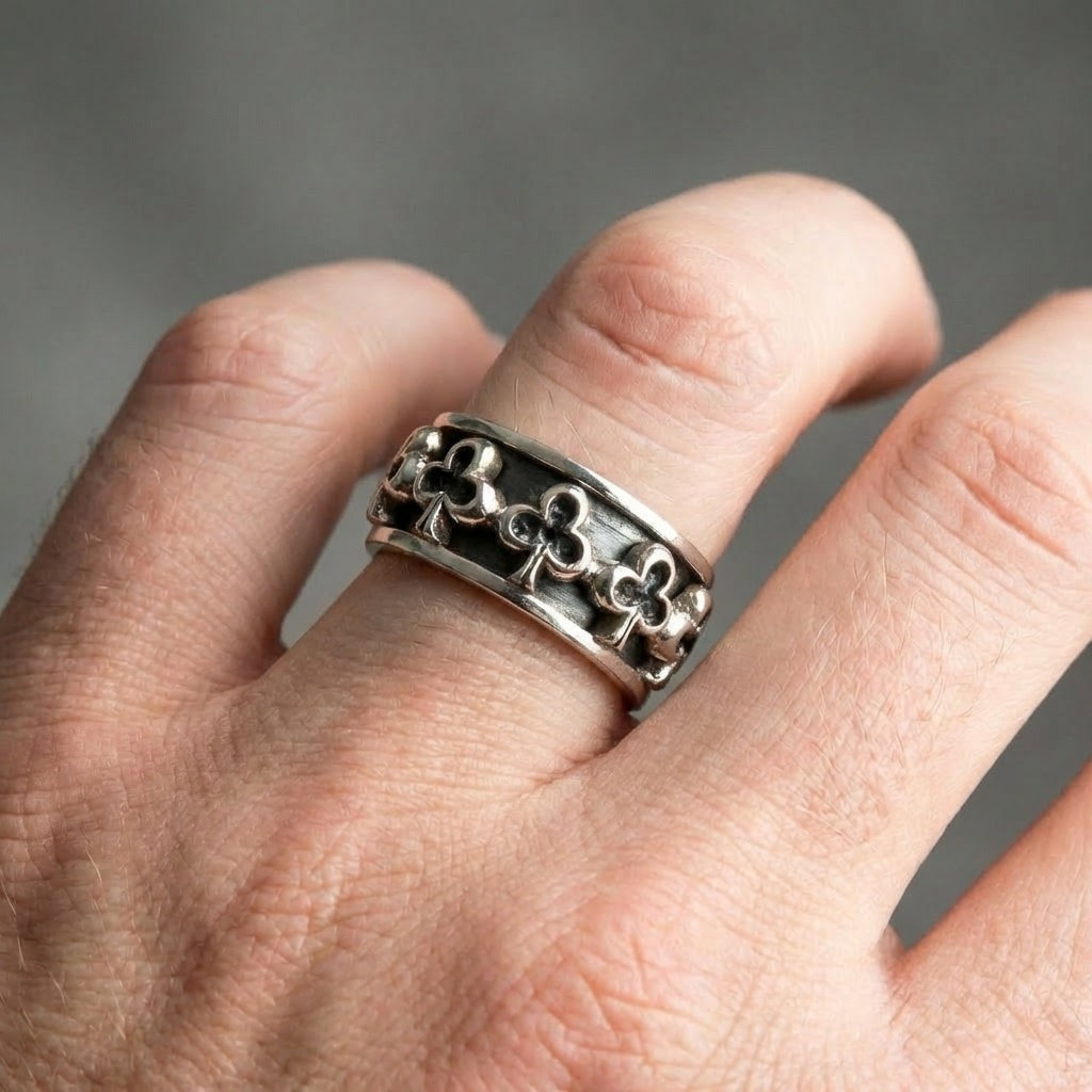 क्लब स्टर्लिंग सिल्वर स्पिनर रिंग, एक विशिष्ट कृति जो बोल्ड डिज़ाइन को मजबूत बाइकर भावना के साथ जोड़ती है। ठोस 925 स्टर्लिंग सिल्वर से कुशलता से निर्मित, इसमें जटिल नक्काशीदार मोटिफ और एक आसानी से घूमने वाला बाहरी बैंड है, जो ध्यान और विश्राम को बढ़ावा देने वाला स्पर्श अनुभव देता है।