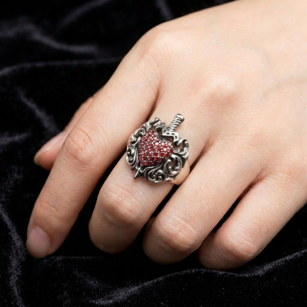 लाल गार्नेट हार्ट डैगर स्टर्लिंग सिल्वर गॉथिक रिंग