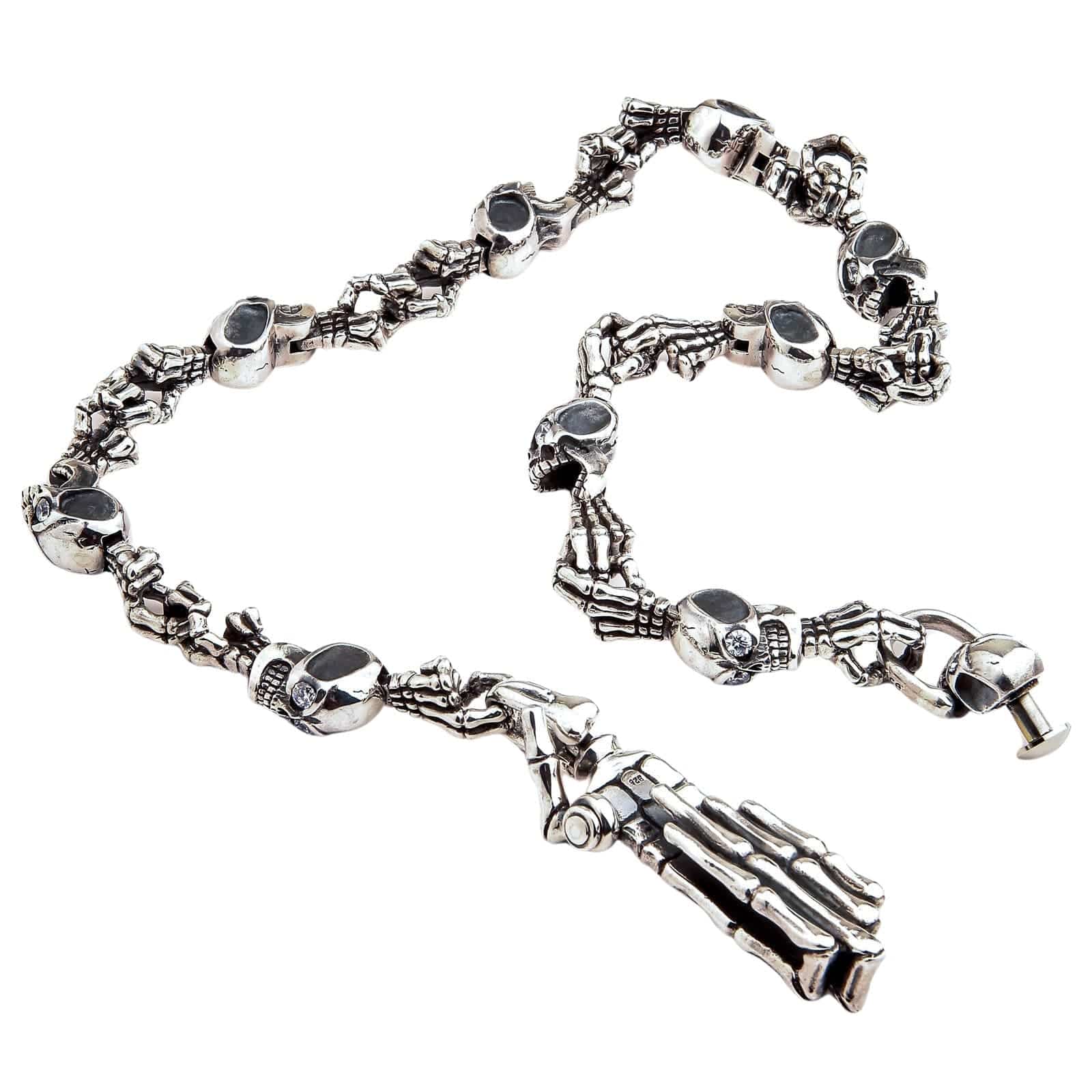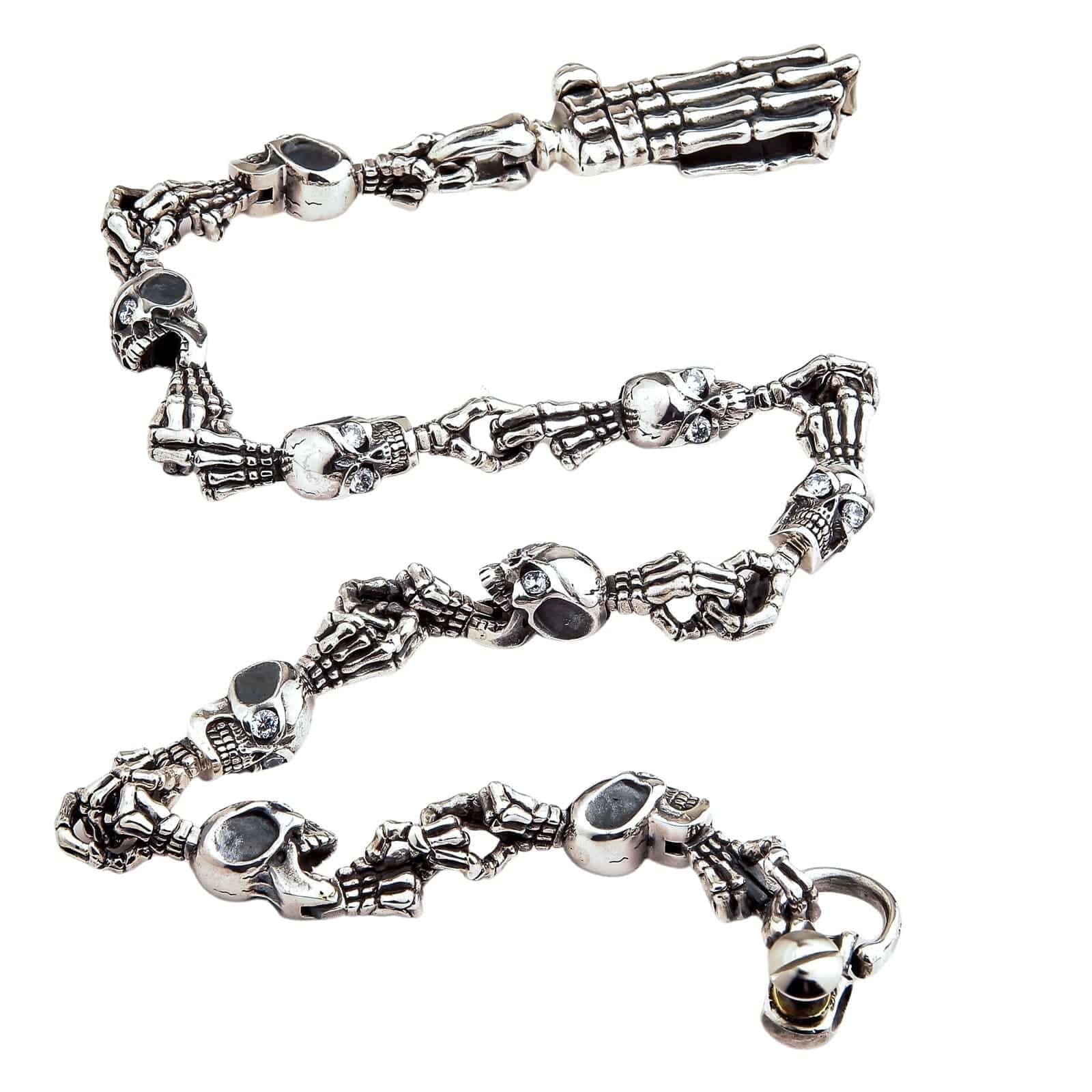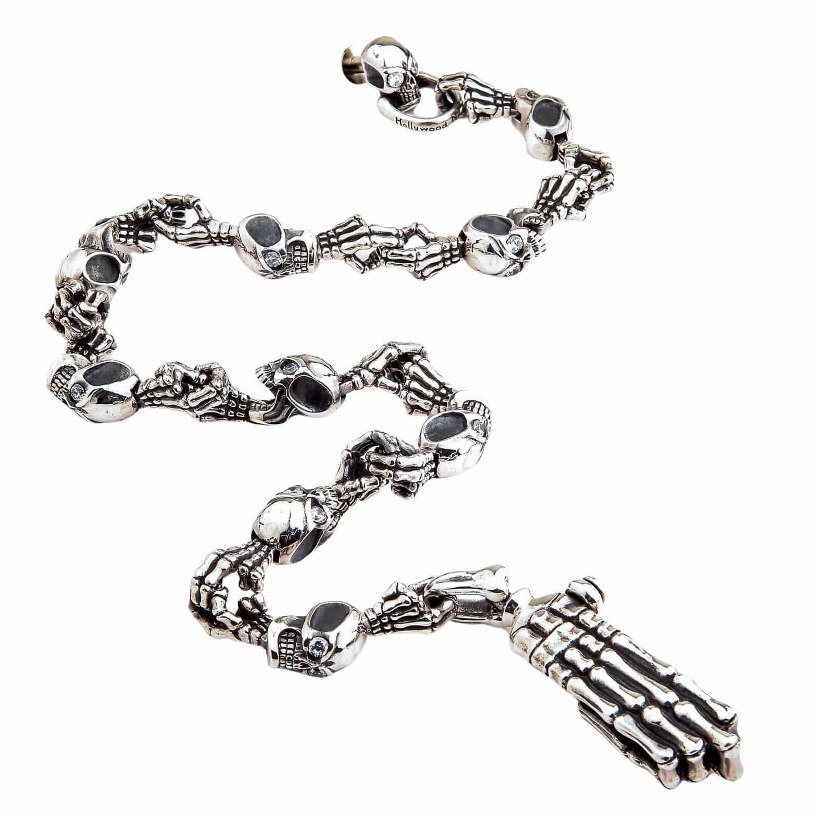Design: Intricate, interlocking skull links connected by skeletal hand joints.